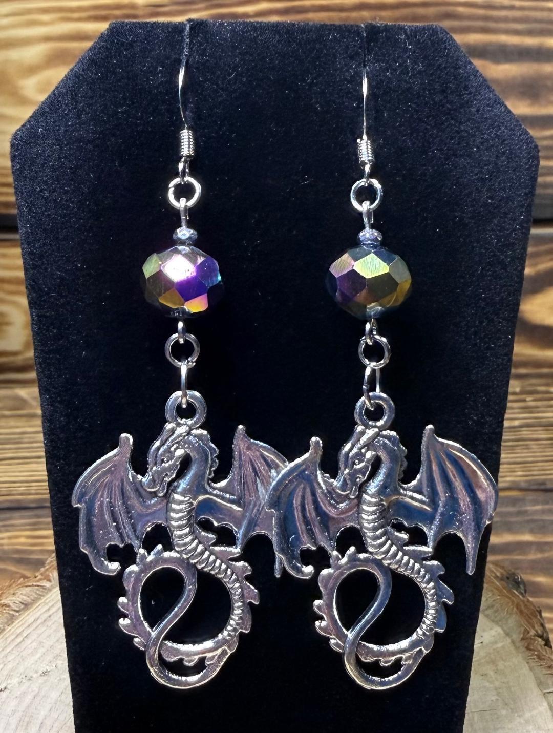 ![]() | Item #: 1006309 Click on image to see more pictures! These are lighter than they look! Made with a large, goth theme, dragon charm and topped with an iridescent glass faceted bead, as well as small silver hematite seed beads. Made with nickel free earring hooks. Measurement Questions? Price: 15.00 |