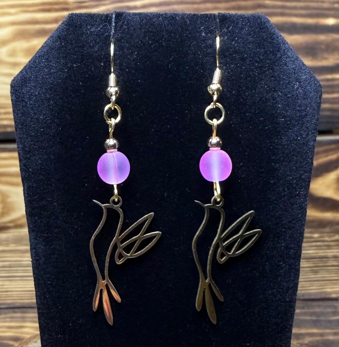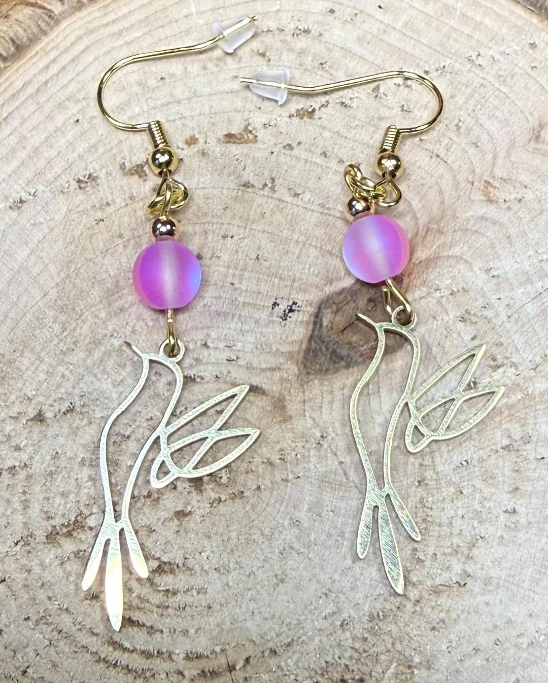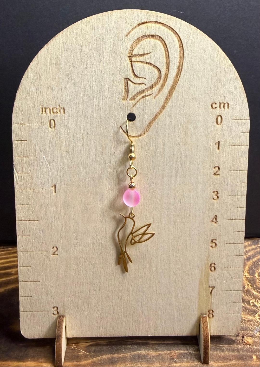 NEW HOLLOW GOLD STAINLESS STEEL BIRD IN FLIGHT EARRINGS W/ PINK BEAD
