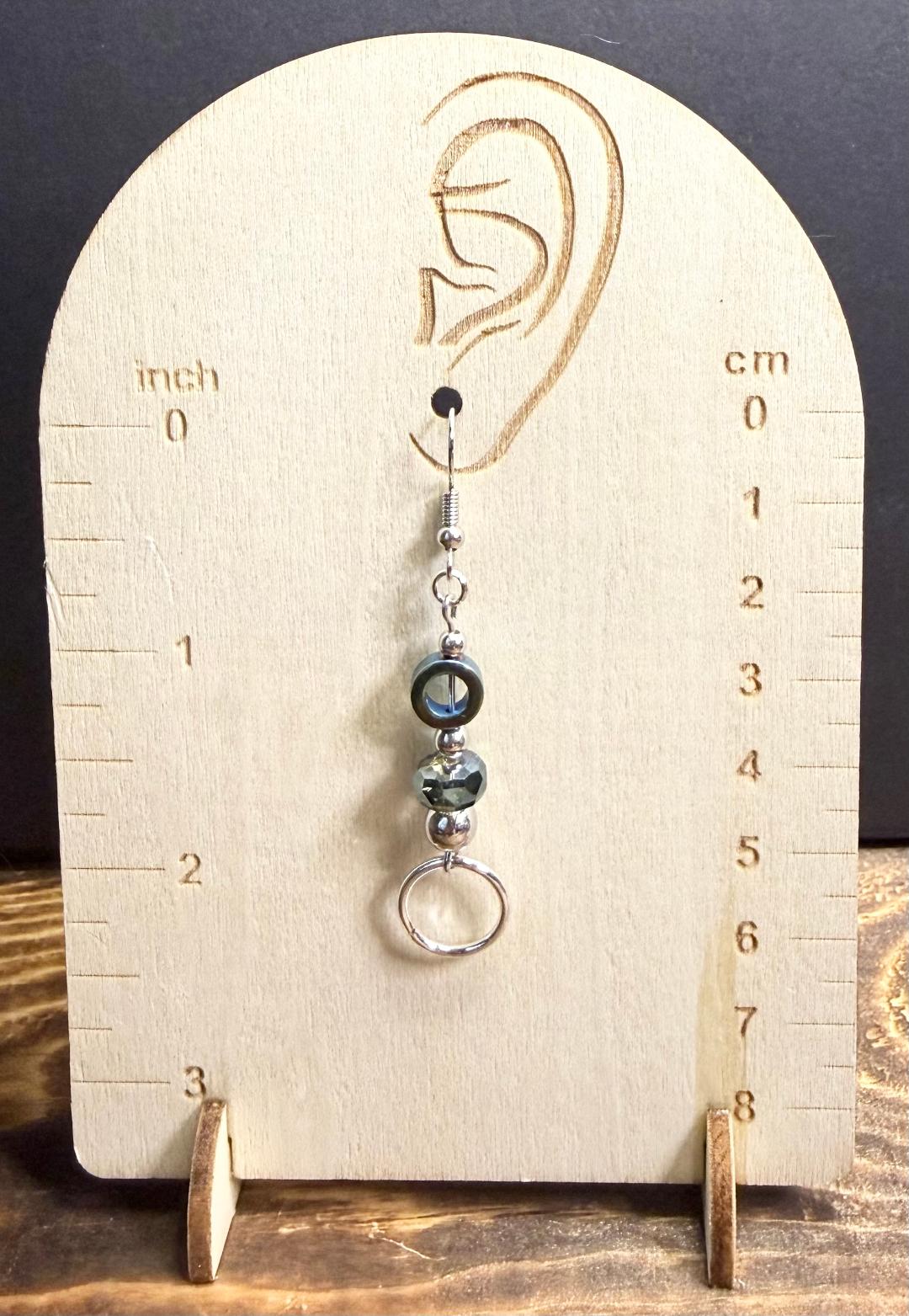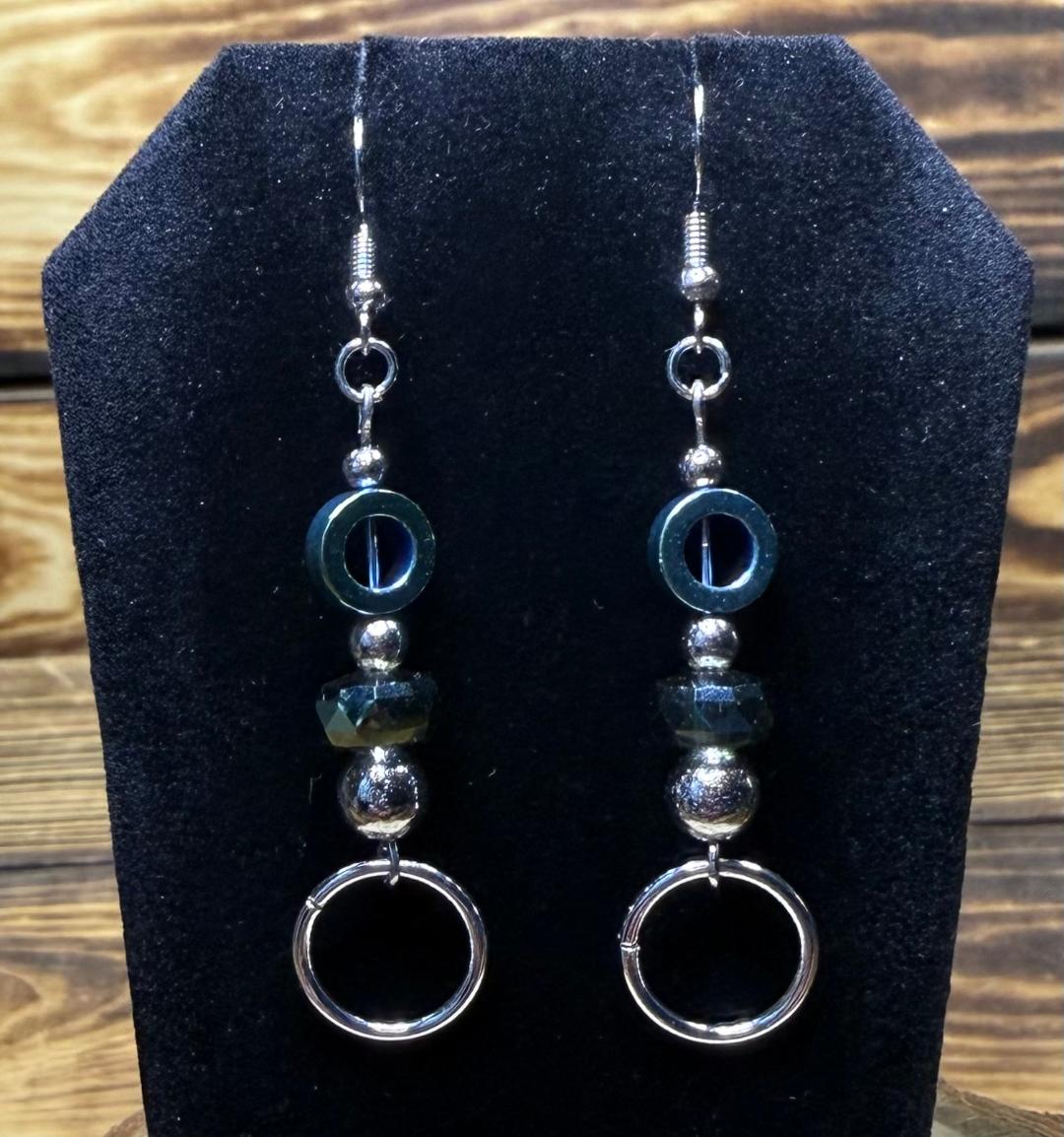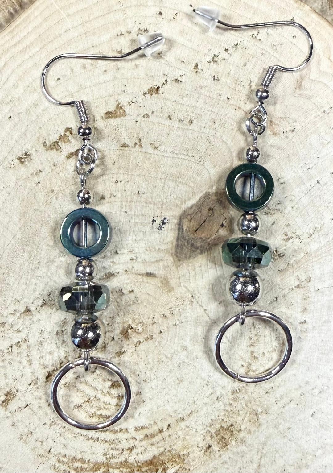 ![]() | Item #: 1006323 Click on image to see more pictures! Made with a circular green, metallic shine hematite charm. They also have silver round beads and a green glass faceted bead, as well as a hollow silver circle at the bottom. Made with nickel free earring hooks. Measurement Questions? Price: 16.00 |