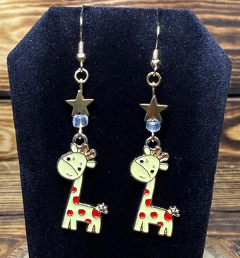 ![]() | Item #: 1006324 Click on image to see more pictures! Darling little cartoon giraffe charm earrings, topped with hematite stars and opague seed beads. Made with 18K gold plated, nickel free earring hooks. Measurement Questions? Price: 16.00 |
