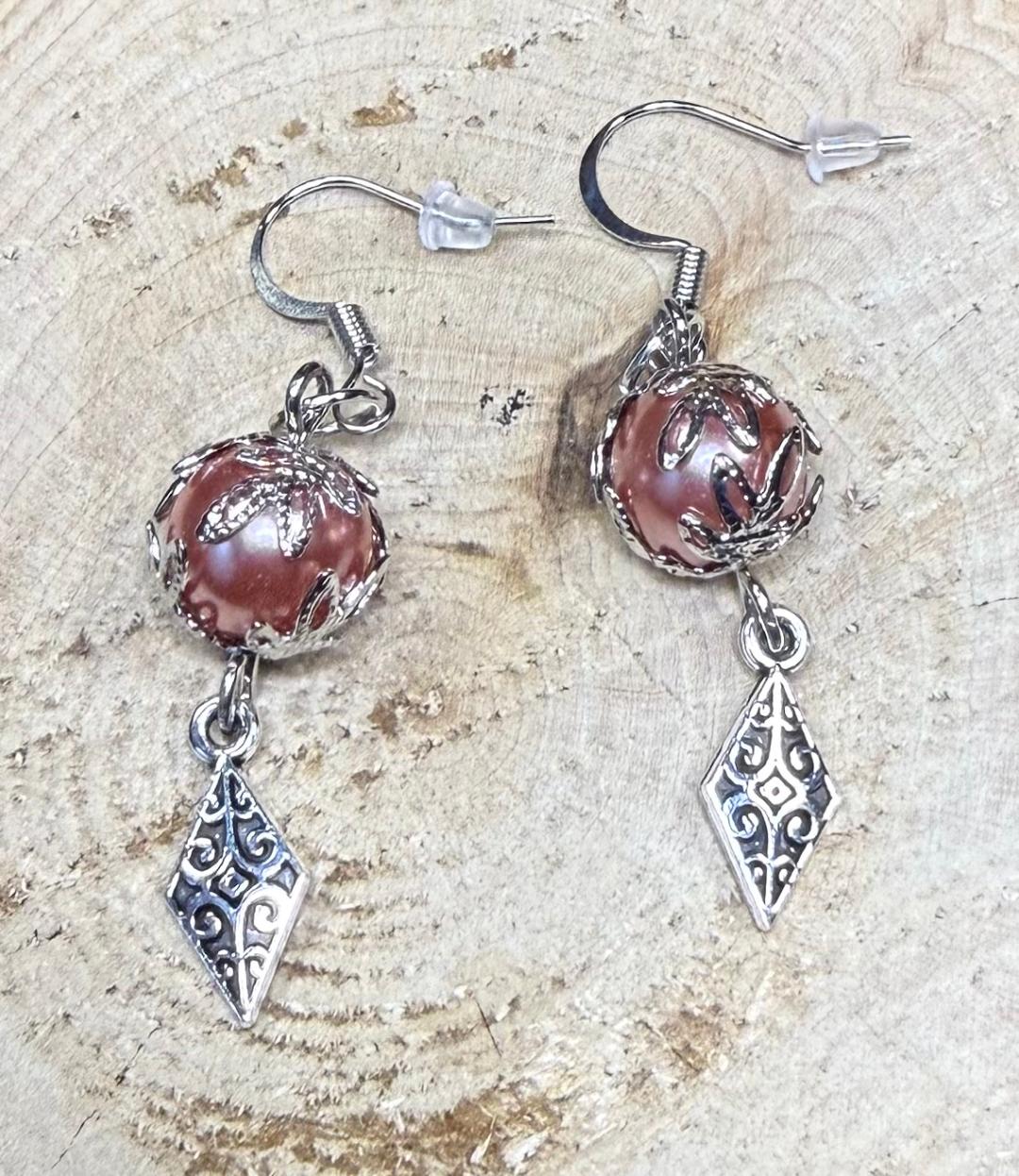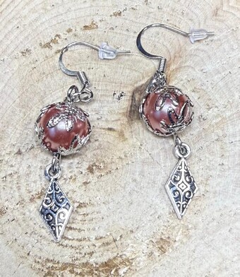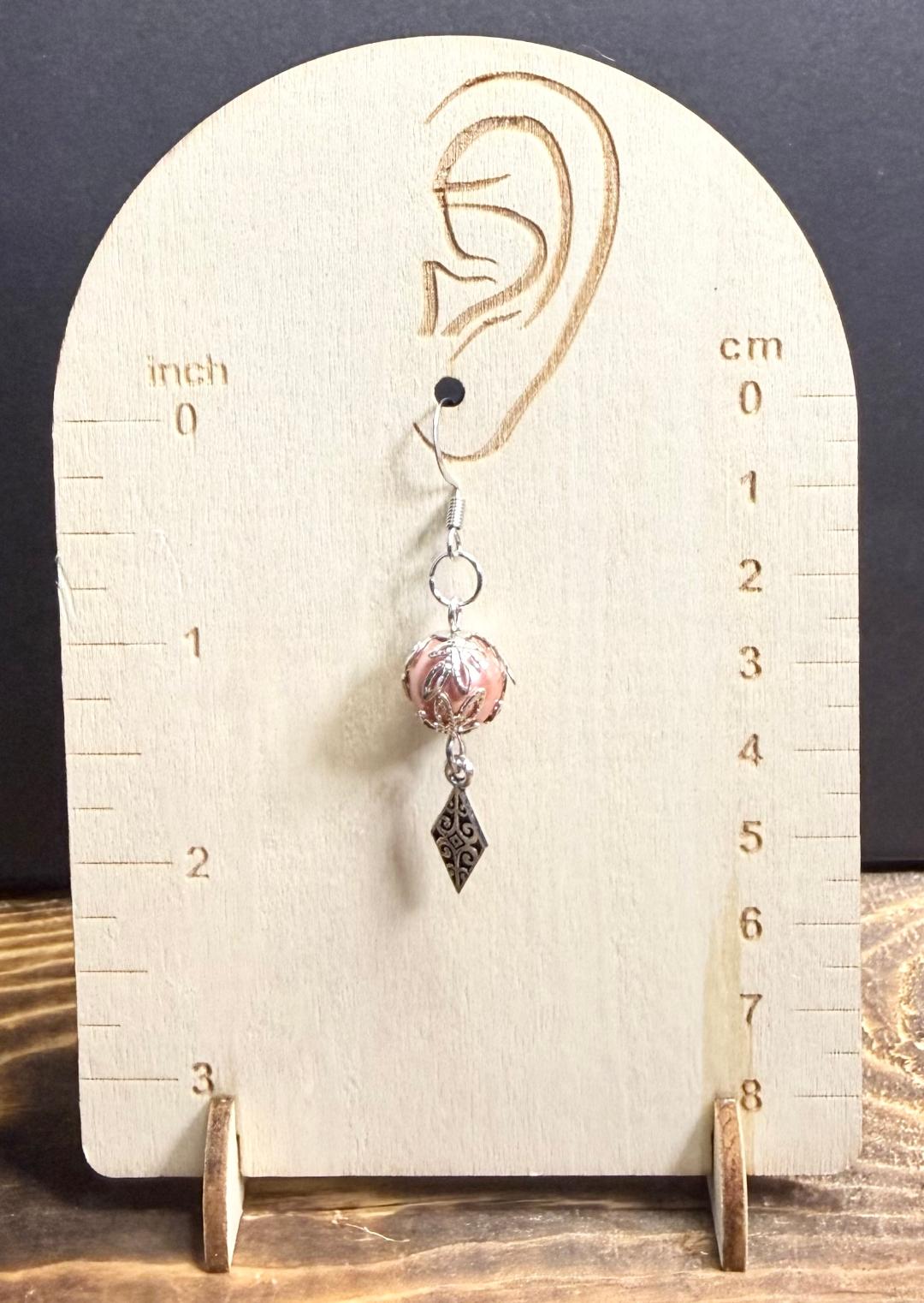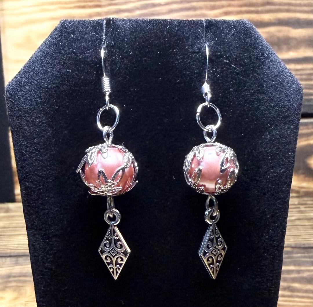 ![]() | Item #: 1006326 Click on image to see more pictures! Gorgeous glass mauve pink pearls, capped in a filigree leaf cap for an elegant look. Dangling from the bottom is a filagree diamond shaped charm. Made with nickel free earring hooks. Measurement Questions? Price: 15.00 |