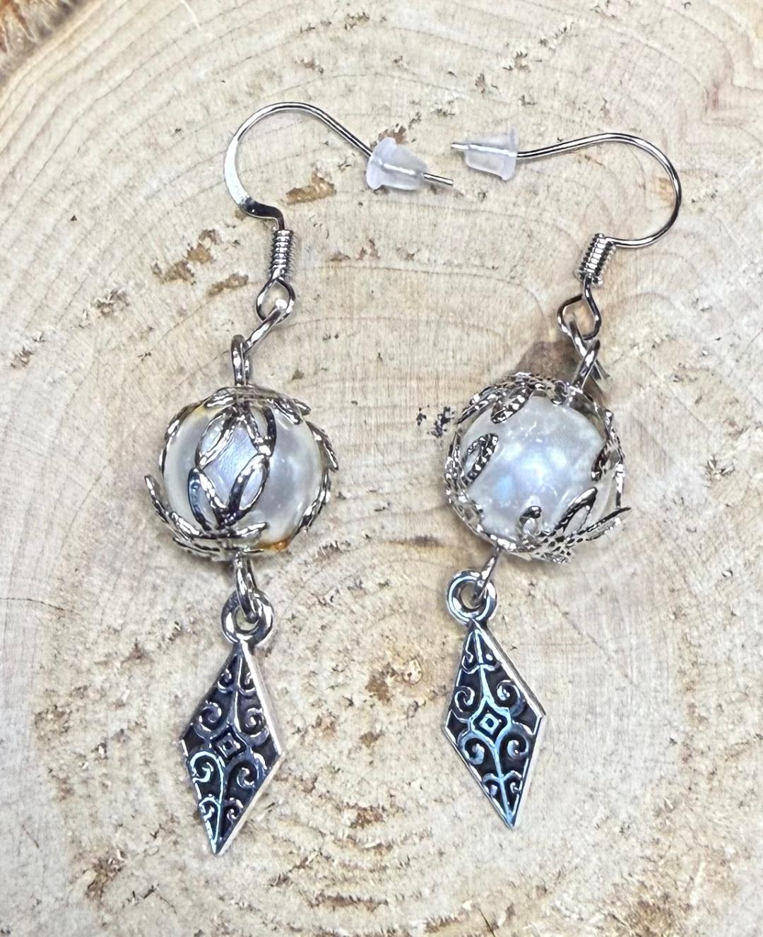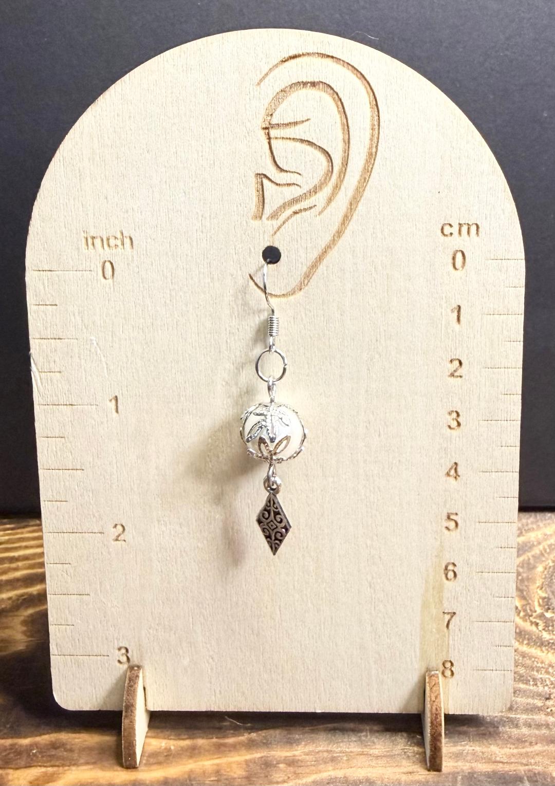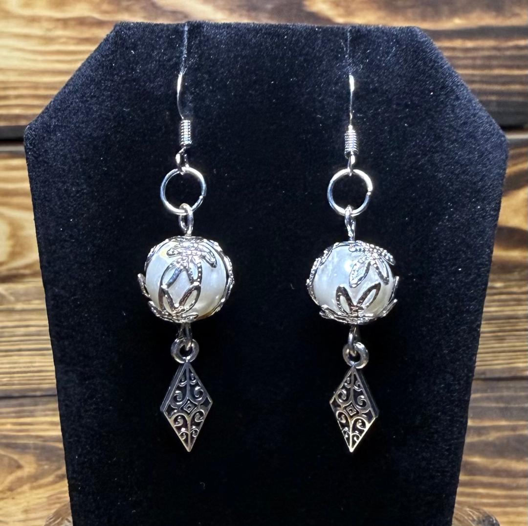 ![]() | Item #: 1006327 Click on image to see more pictures! Gorgeous glass white pearls, capped in a filigree leaf cap for an elegant look. Dangling from the bottom is a filagree diamond shaped charm. Made with nickel free earring hooks. Measurement Questions? Price: 15.00 |