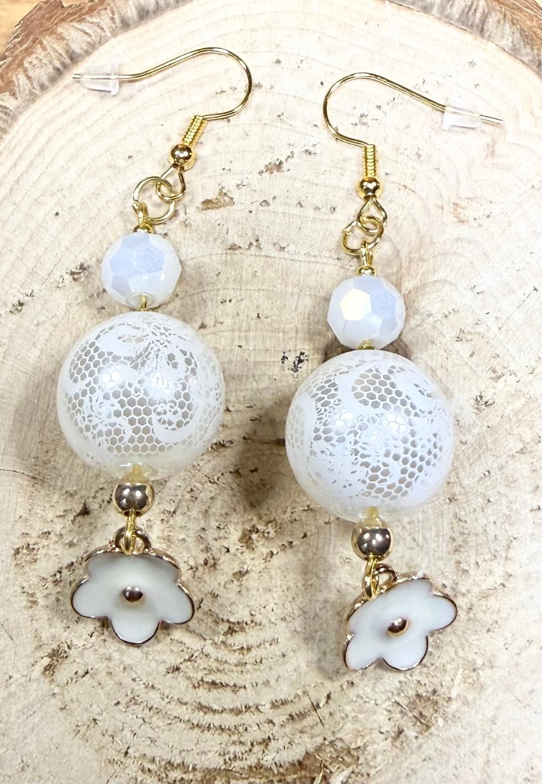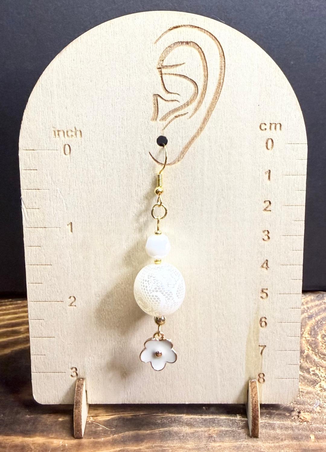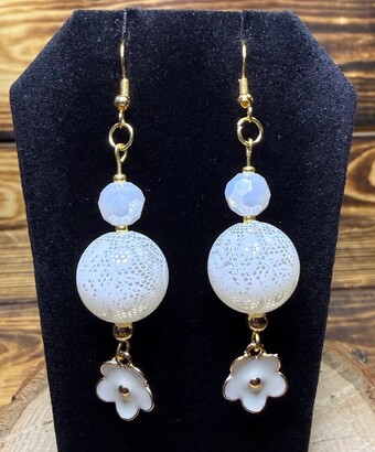 ![]() | Item #: 1006333 Click on image to see more pictures! A unique pair of earrings that are made with a larger size acrylic white round bead that has a lace style surface. They are topped with a white glass faceted bead, as well as a petite white face enamel flower at the bottom. Measurement Questions? Price: 12.00 |