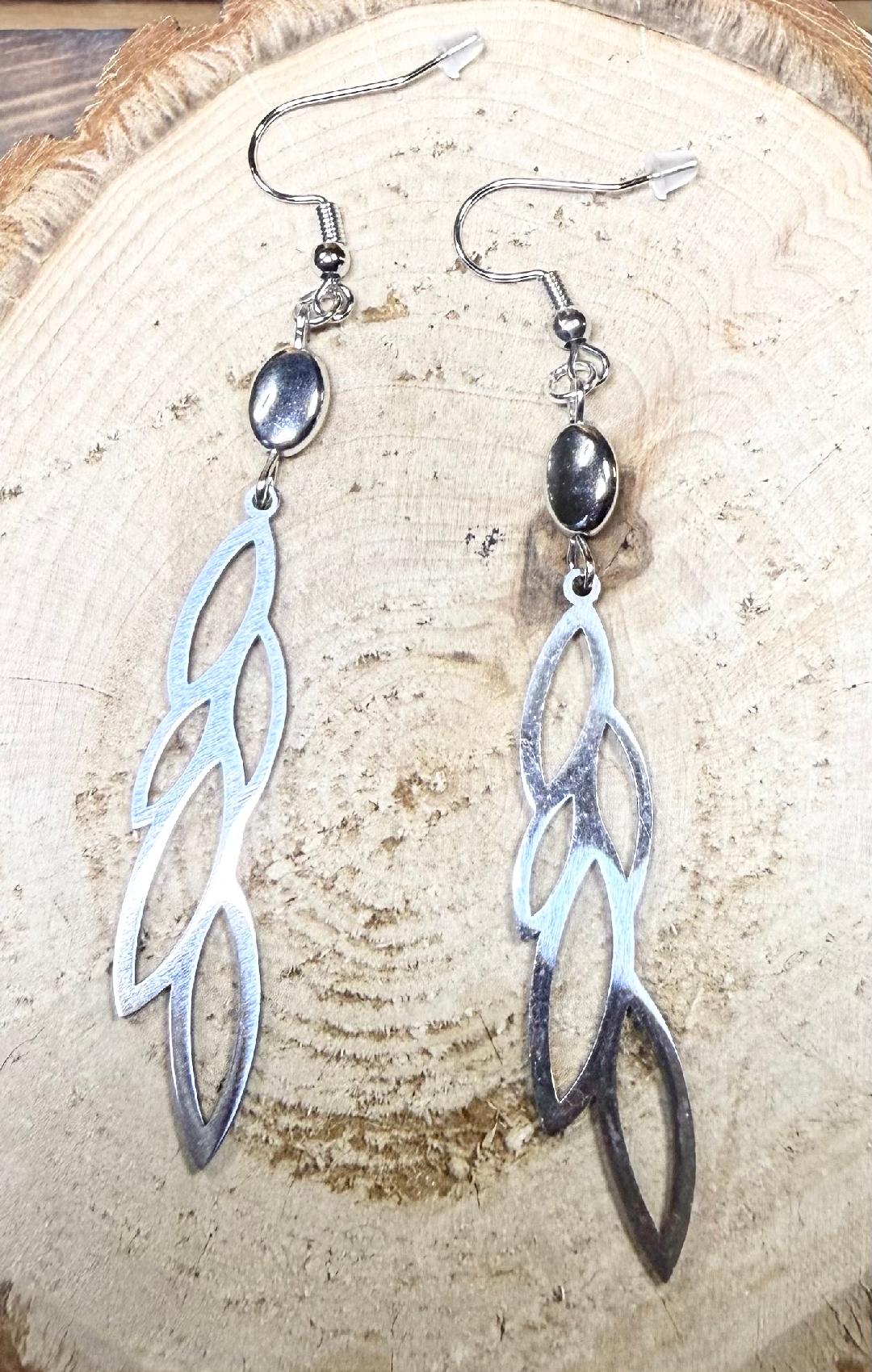 ![]() | Item #: 1006337 Click on image to see more pictures! A simple, but dramatic, cascading leaf vine of stainless steel, topped with a small oval silver bead. Made with nickel free earring hooks. Measurement Questions? Price: 16.00 |
