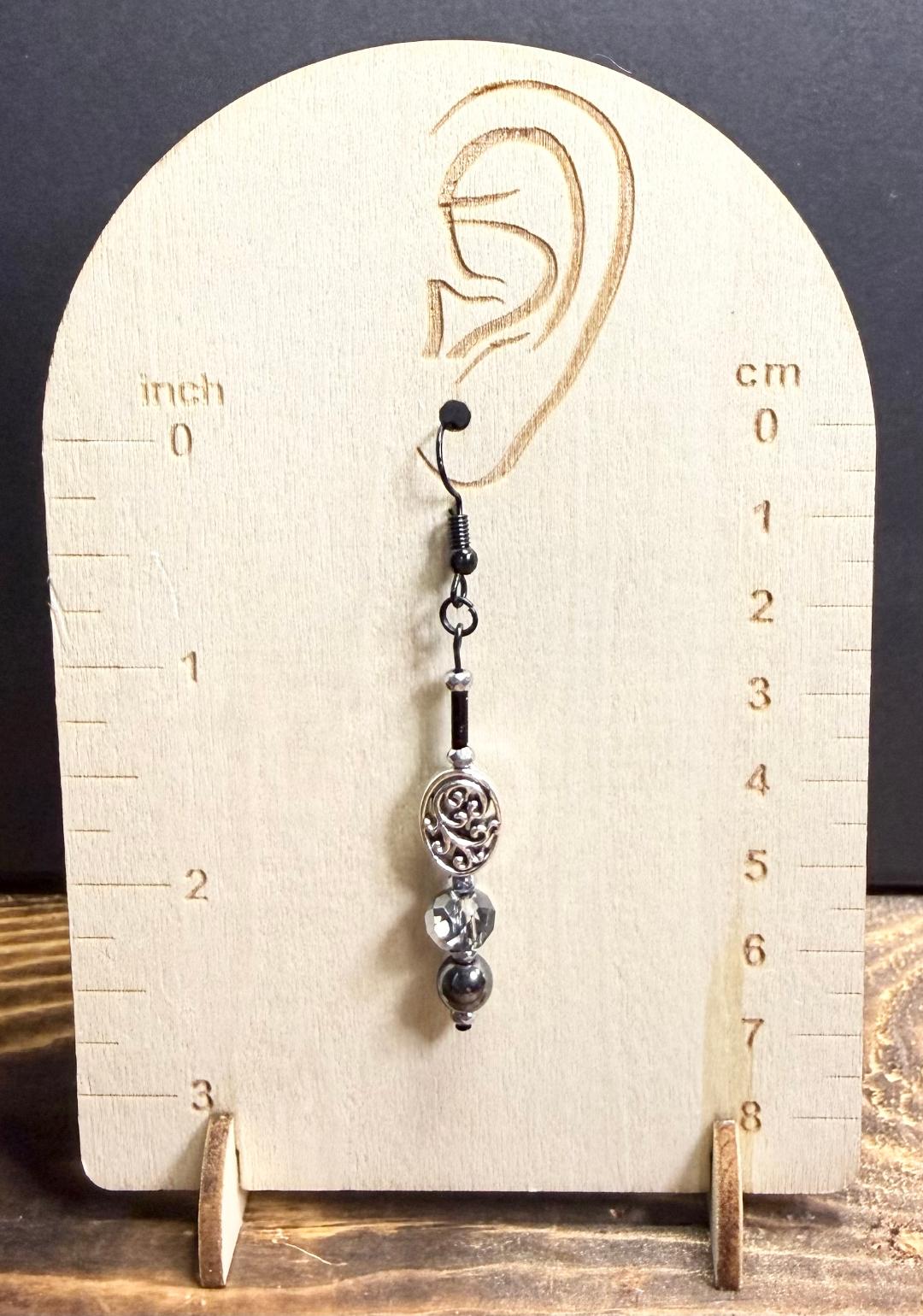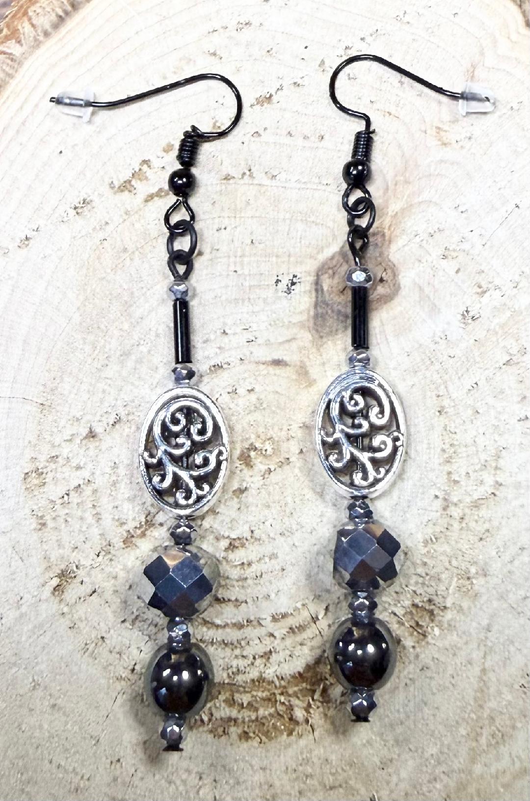 ![]() | Item #: 1006338 Click on image to see more pictures! Made with an oval spacer bead charm with a filigree design, as well as a silver plated glass bead, Czech glass black tube beads, silver hematite beads. The ear hooks are coated black design. Measurement Questions? Price: 15.00 |