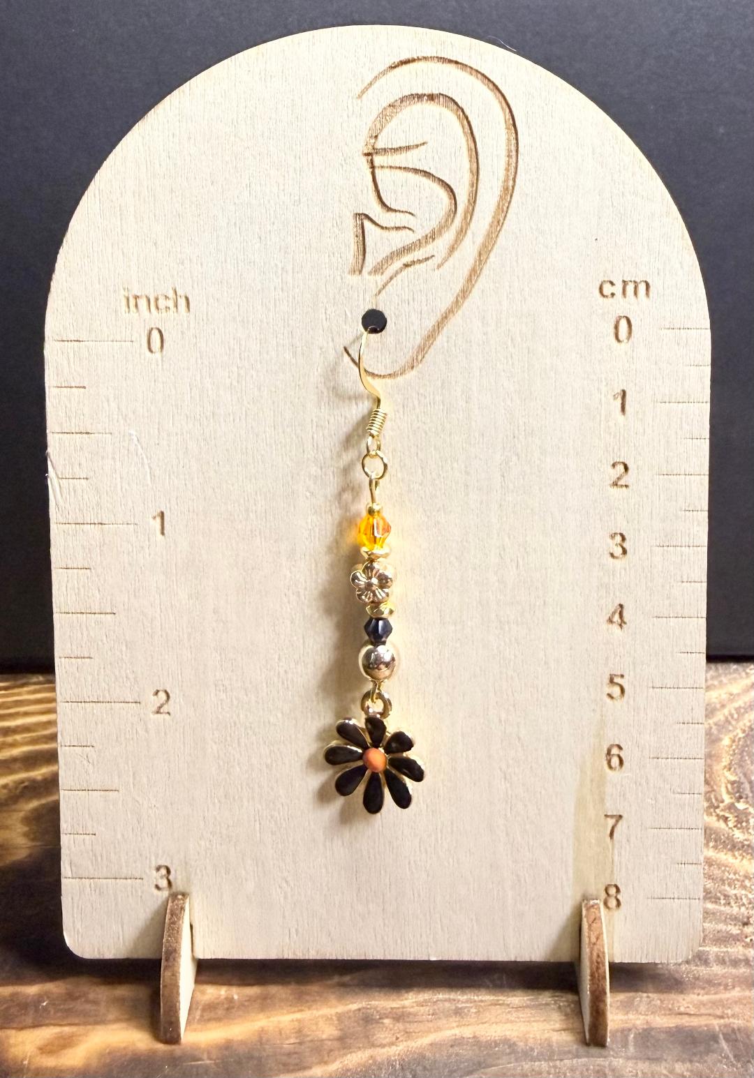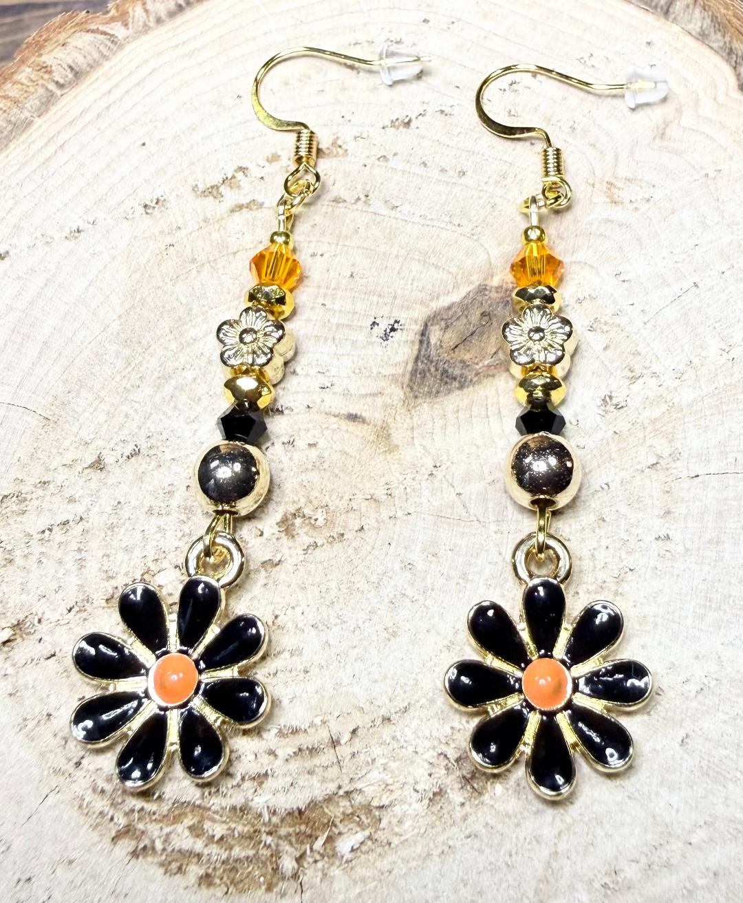 NEW BLACK ENAMEL DAISY EARRING W/ ORANGE & BLACK BEADS