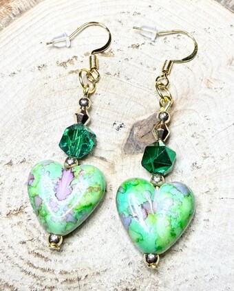 ![]() | Item #: 1006344 Click on image to see more pictures! Very pretty, Bandhani style painted acrylic heart charms in a primary color of green. Topped with vivid green faceted plated glass beads, as well as small gold seed beads. Made with 18K gold plated, nickel free earring hooks. Measurement Questions? Price: 16.00 |