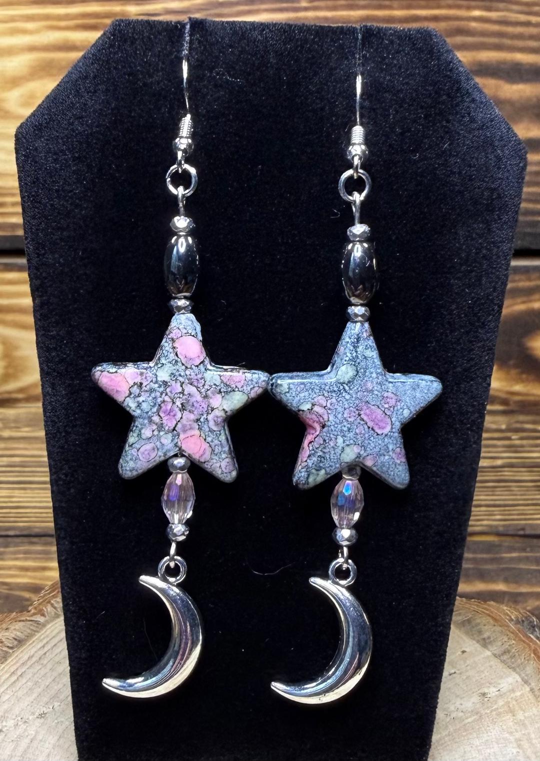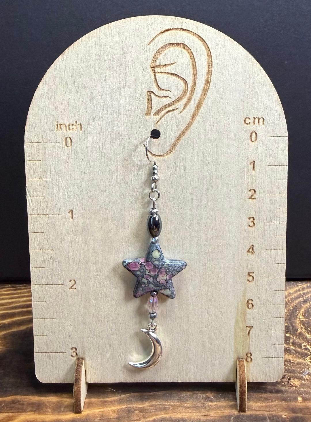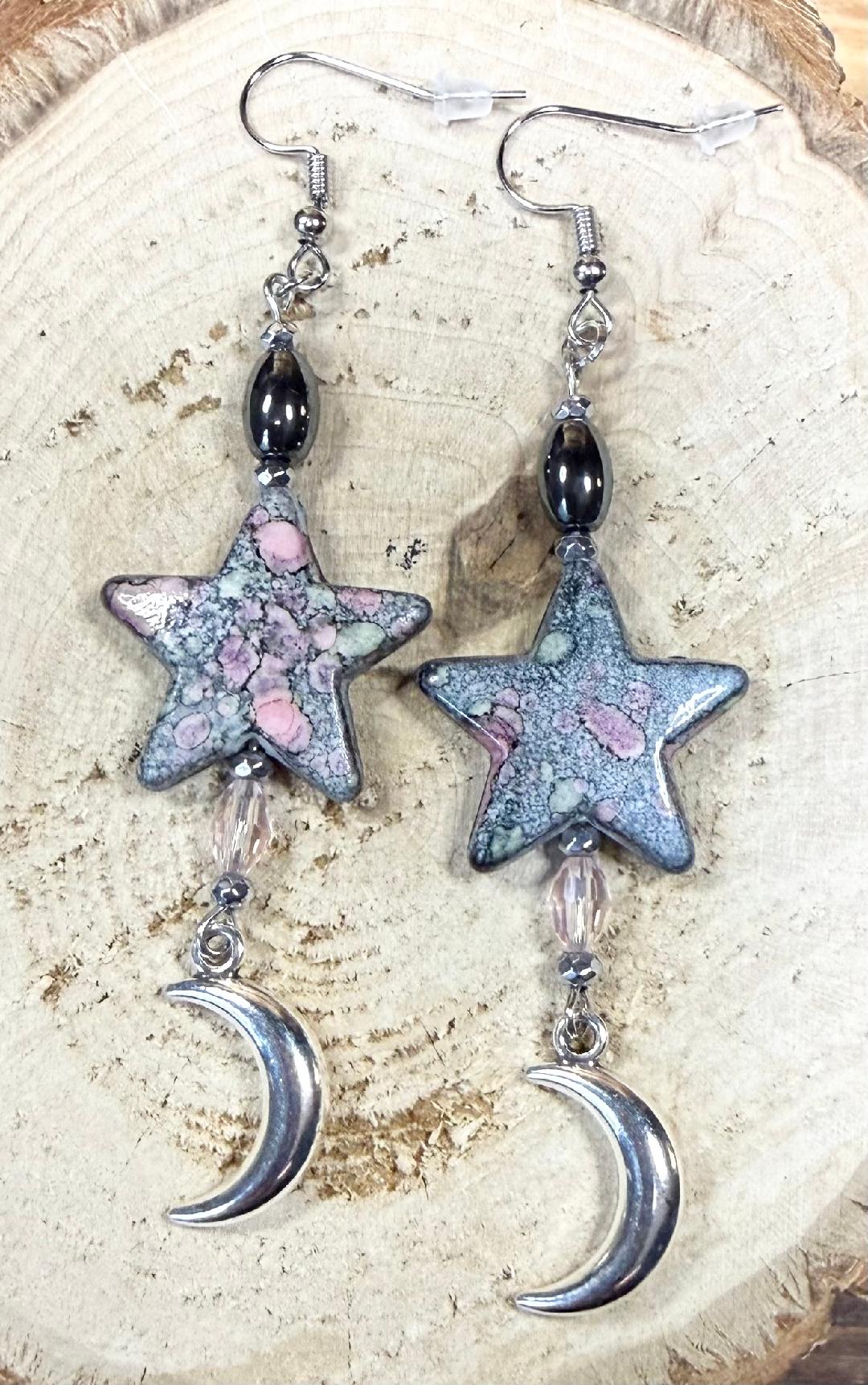 ![]() | Item #: 1006347 Click on image to see more pictures! Bandhani style painted acrylic heart charms in primary colors of gray & pink. The main charm is an acrylic star, along with hematite silver beads, a pale pink oval glass faceted bead, along with a silver crescent moon at the bottom. Made with nickel free earring hooks. Measurement Questions? Price: 18.00 |