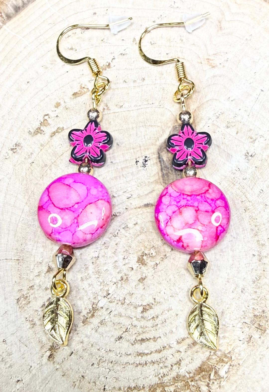 NEW BANDHANI STYLE HOT PINK ROUND EARRINGS W/ FLOWER BEAD & LEAF CHARMS