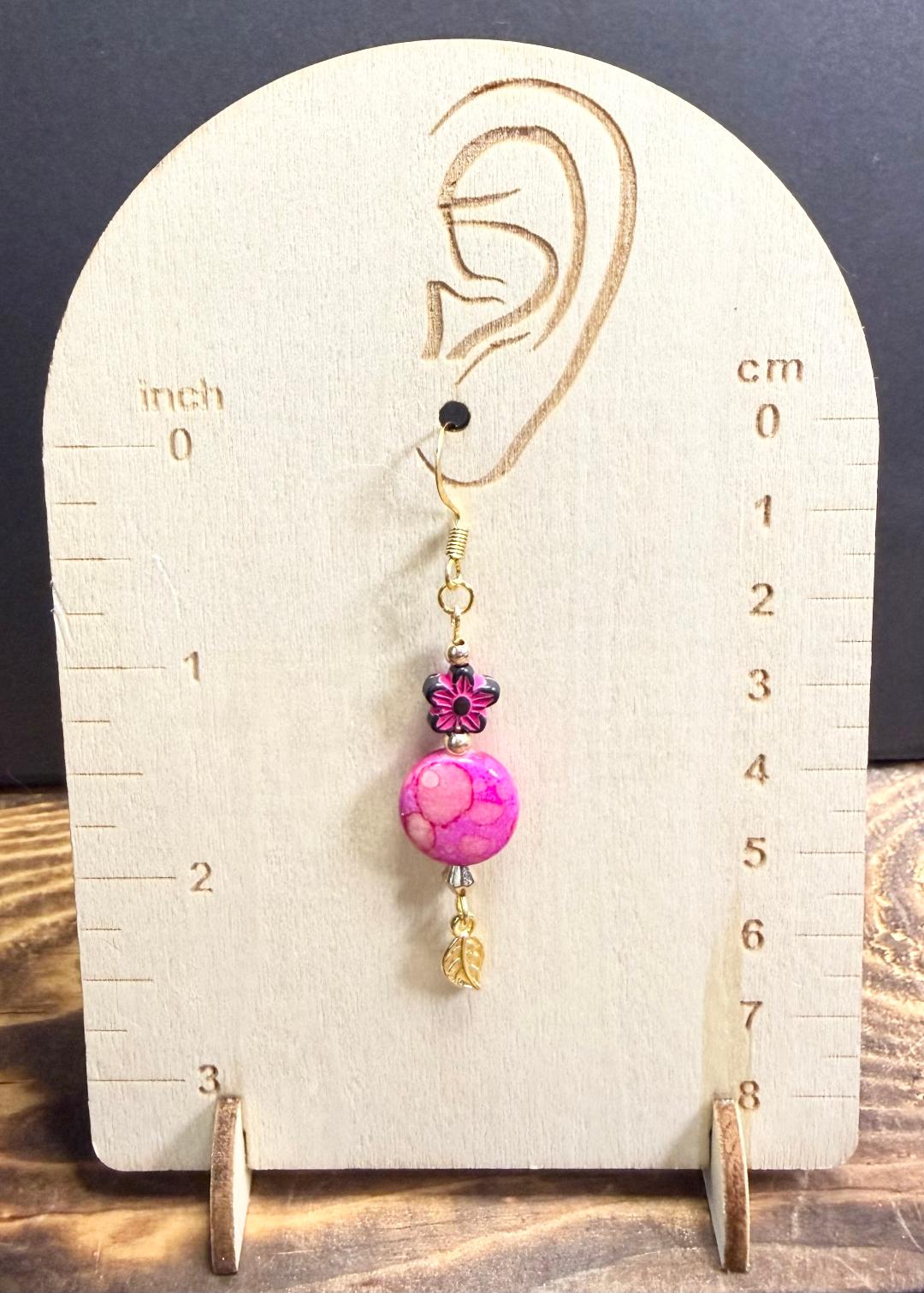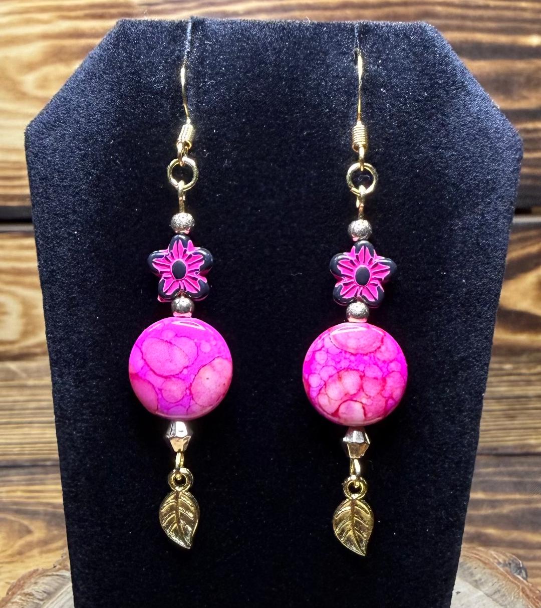 ![]() | Item #: 1006358 Click on image to see more pictures! Boho earrings with hot pink Bandhani style round beads in the center, pink & black flower above and a gold leaf at the bottom. Made with 18K gold plated, nickel free earring hooks. Measurement Questions? Price: 18.00 |