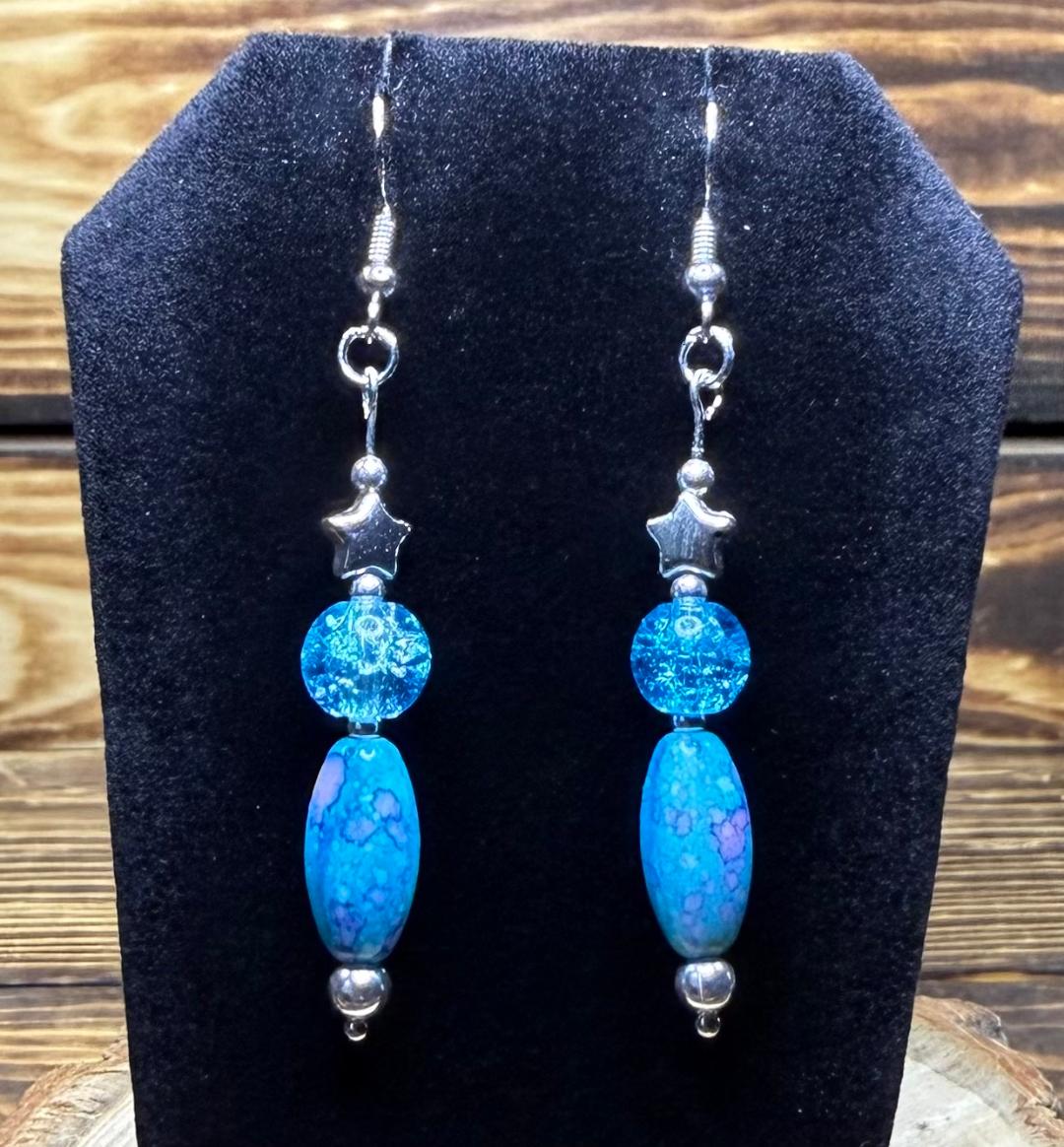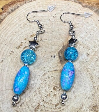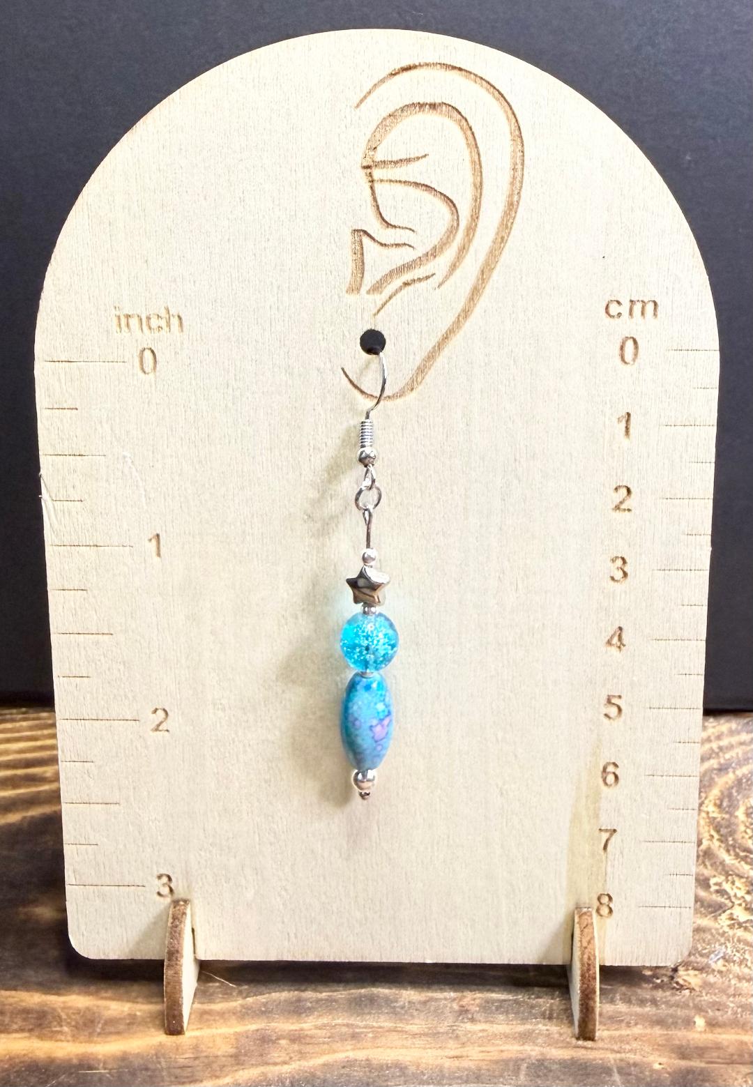 ![]() | Item #: 1006362 Click on image to see more pictures! A unique pair of Bandhani style earrings with the focal point being the vivid teal blue rice bead with pink accents. Topped with a teal glass crackle bead, as well as a dainty star bead. Made with nickel free hooks. Measurement Questions? Price: 16.00 |