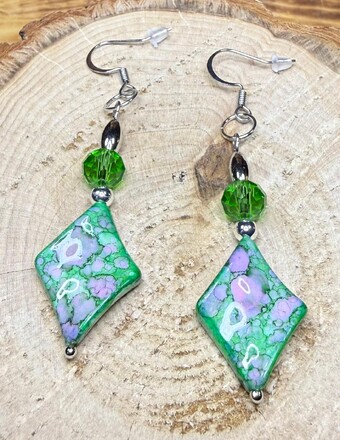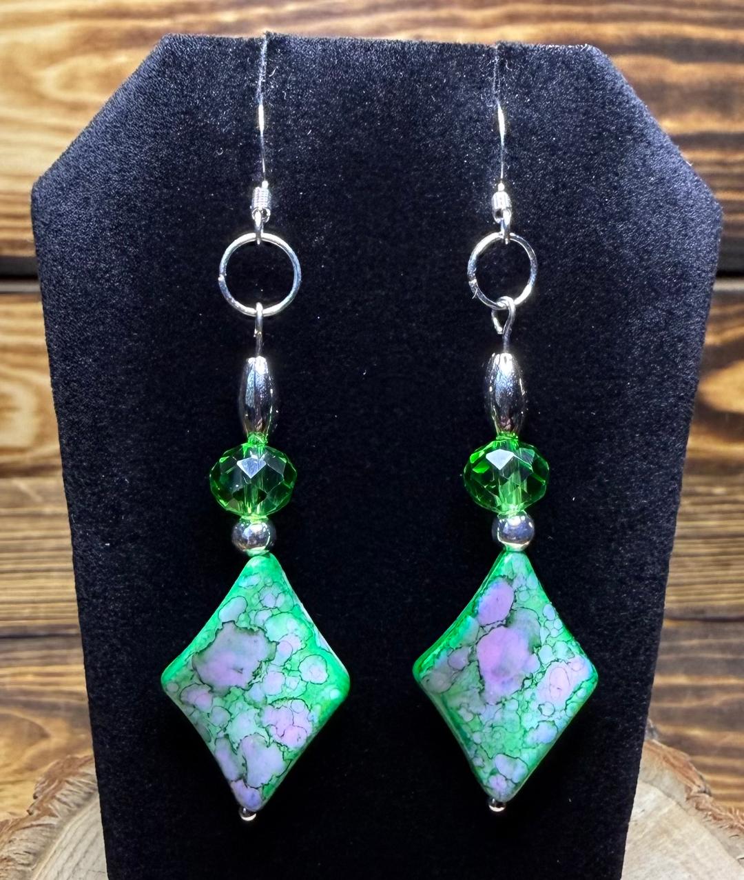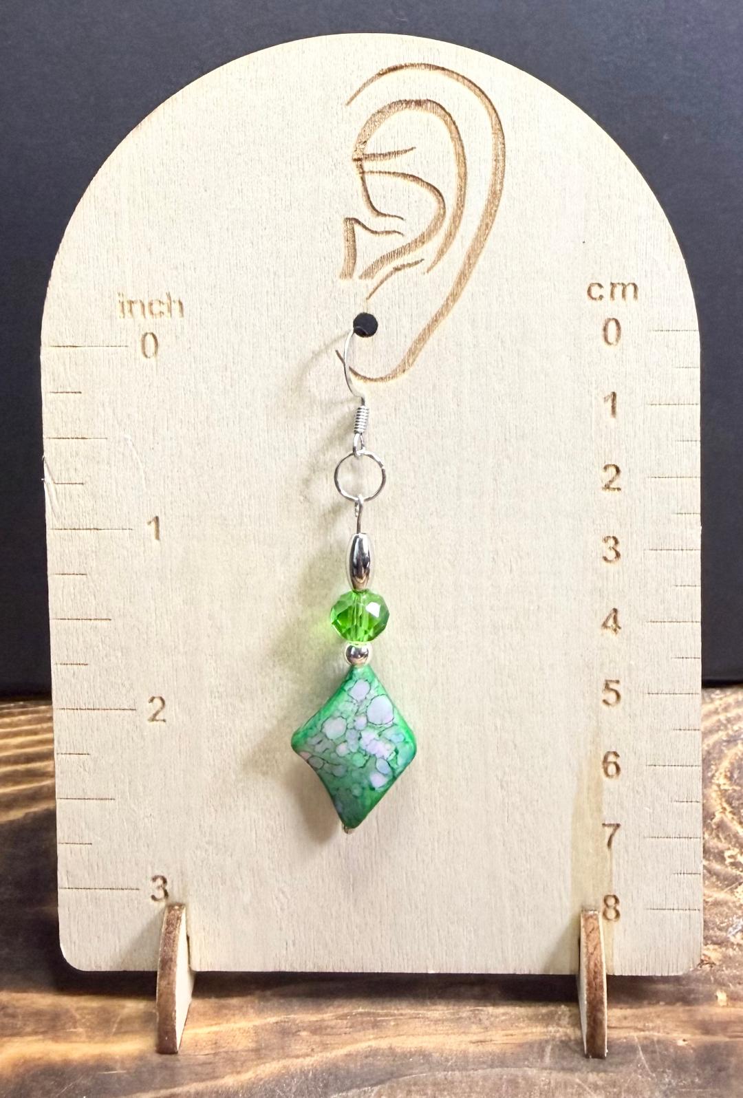 NEW BANDHANI STYLE GREEN DIAMOND SHAPE EARRINGS W/ GLASS BEADS