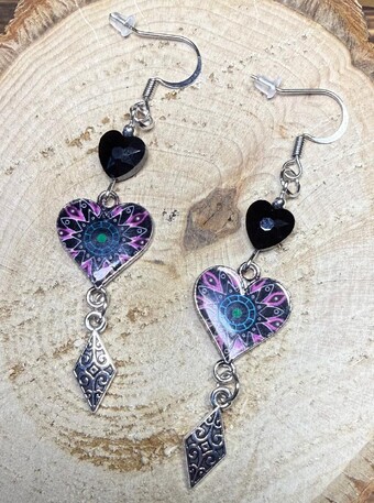 ![]() | Item #: 1006366 Click on image to see more pictures! A unique pair of earrings featuring a heart charm center with an array of colors including pink, blue, black & green. There is a black glass heart bead on the top, small filigree diamond shaped charm at the bottom. Made with nickel free earring hooks. Measurement Questions? Price: 15.00 |