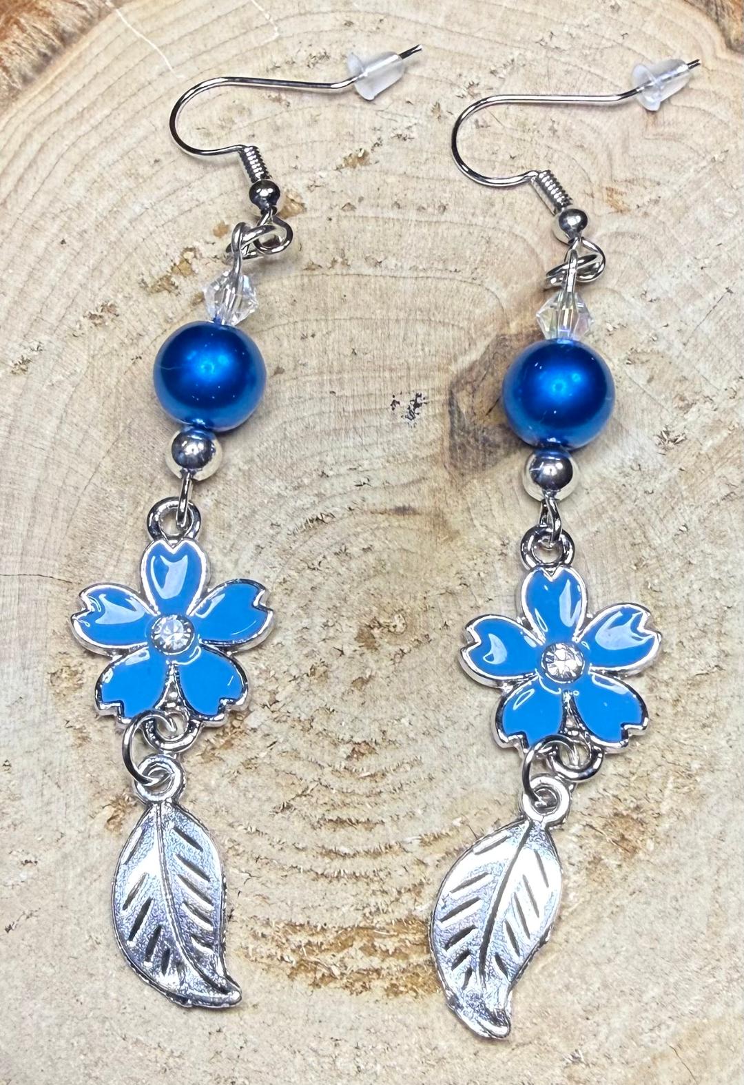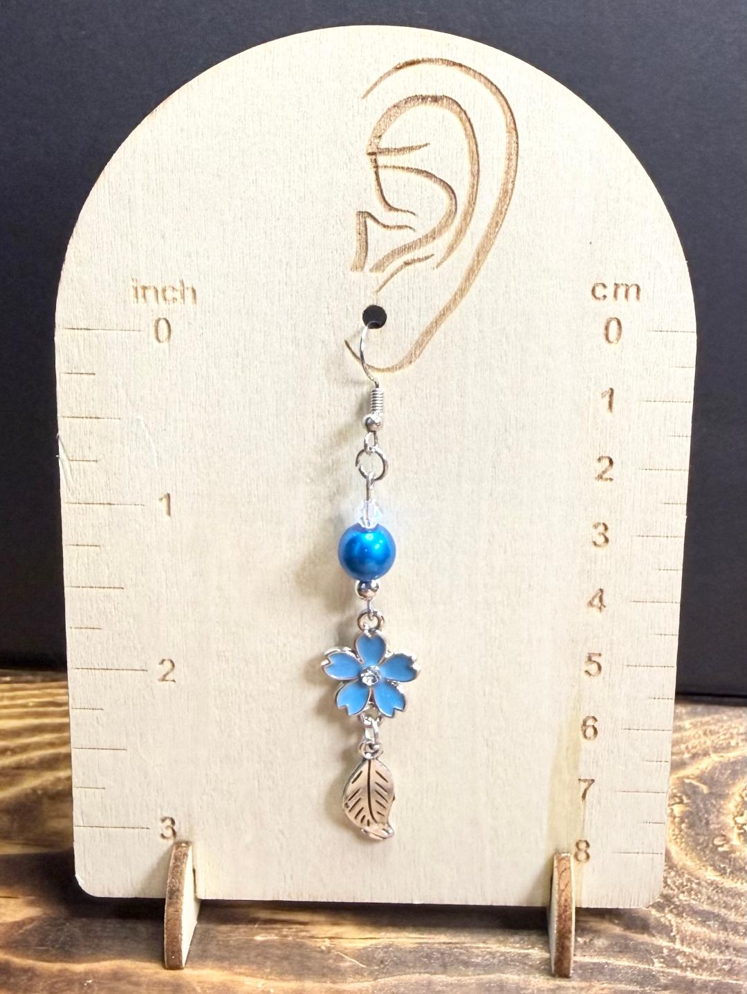 NEW RHINESTONE CENTER BLUE FLOWER EARRINGS, SILVER LEAF CHARM W/ BLUE & CLEAR GLASS BEADS