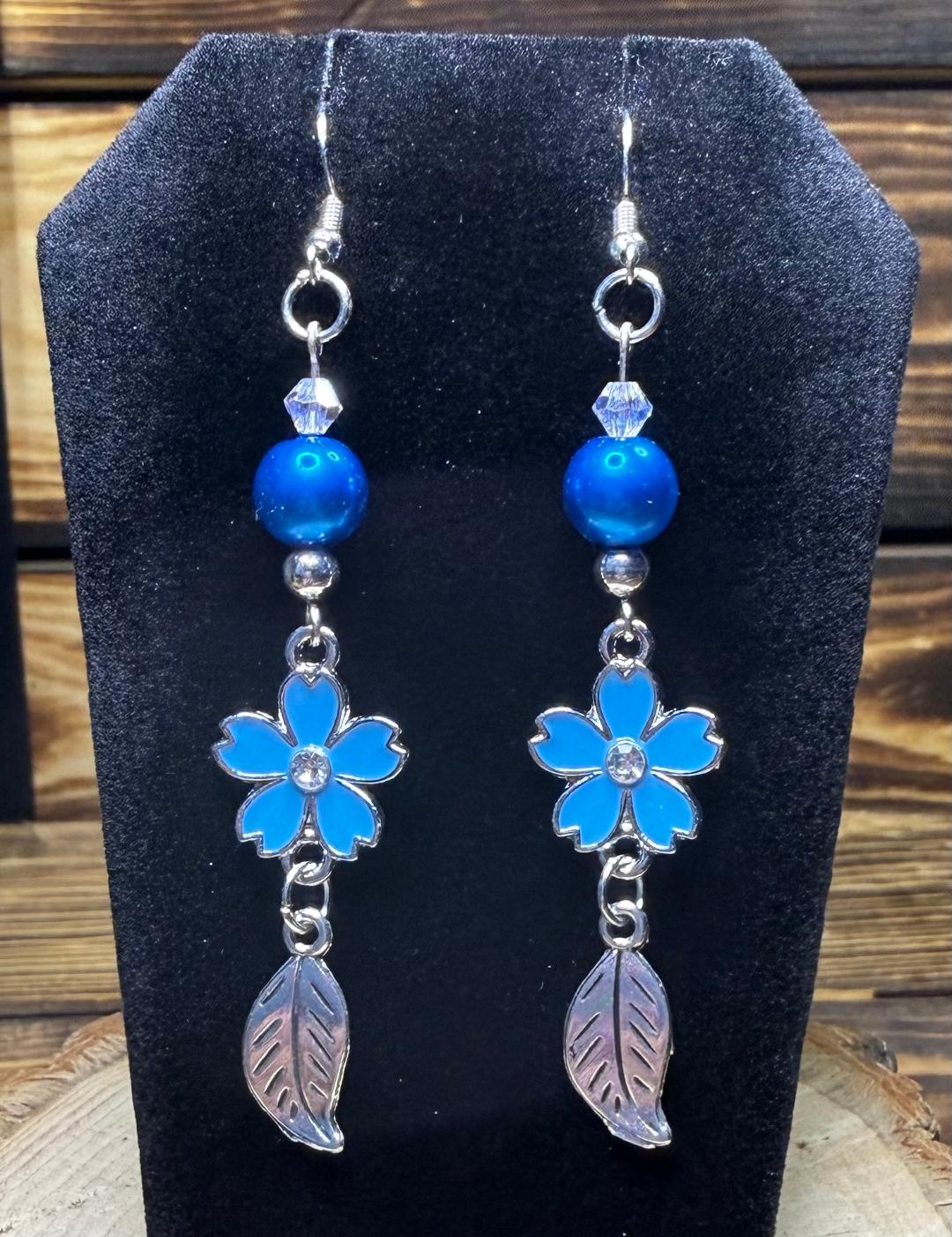 ![]() | Item #: 1006367 Click on image to see more pictures! So pretty, blue flowers with rhinestone centers, topped with a dyed glass blue beads, faceted clear glass beads, and an etched silver leaf charm at the bottom. Made with nickel free earring hooks. Measurement Questions? Price: 18.00 |
