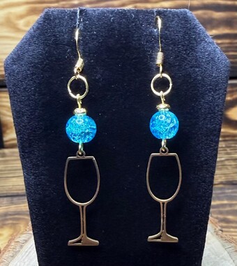 ![]() | Item #: 1006368 Click on image to see more pictures! A fun pair of gold stainless steel earrings in the shape of a hollow wine glass. Topped with blue glass crackle style beads, as well as a small faceted hematite gold seed bead. Made with 18K gold plated, nickel free earring hooks. Measurement Questions? Price: 20.00 |