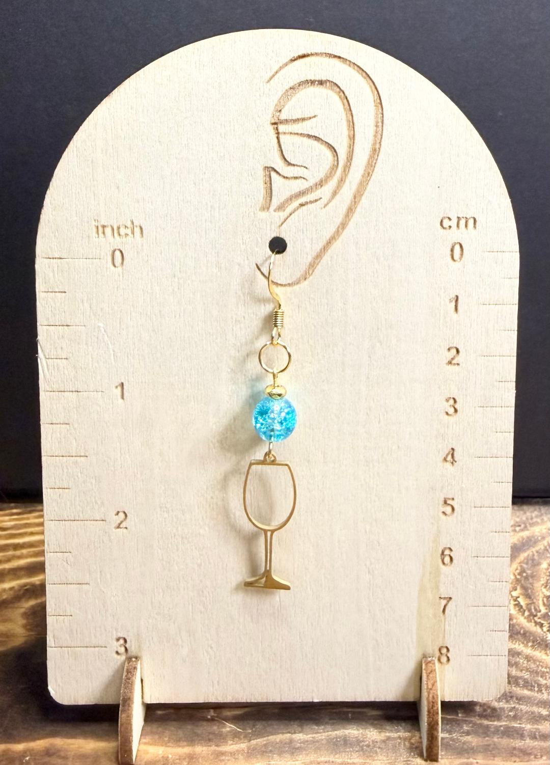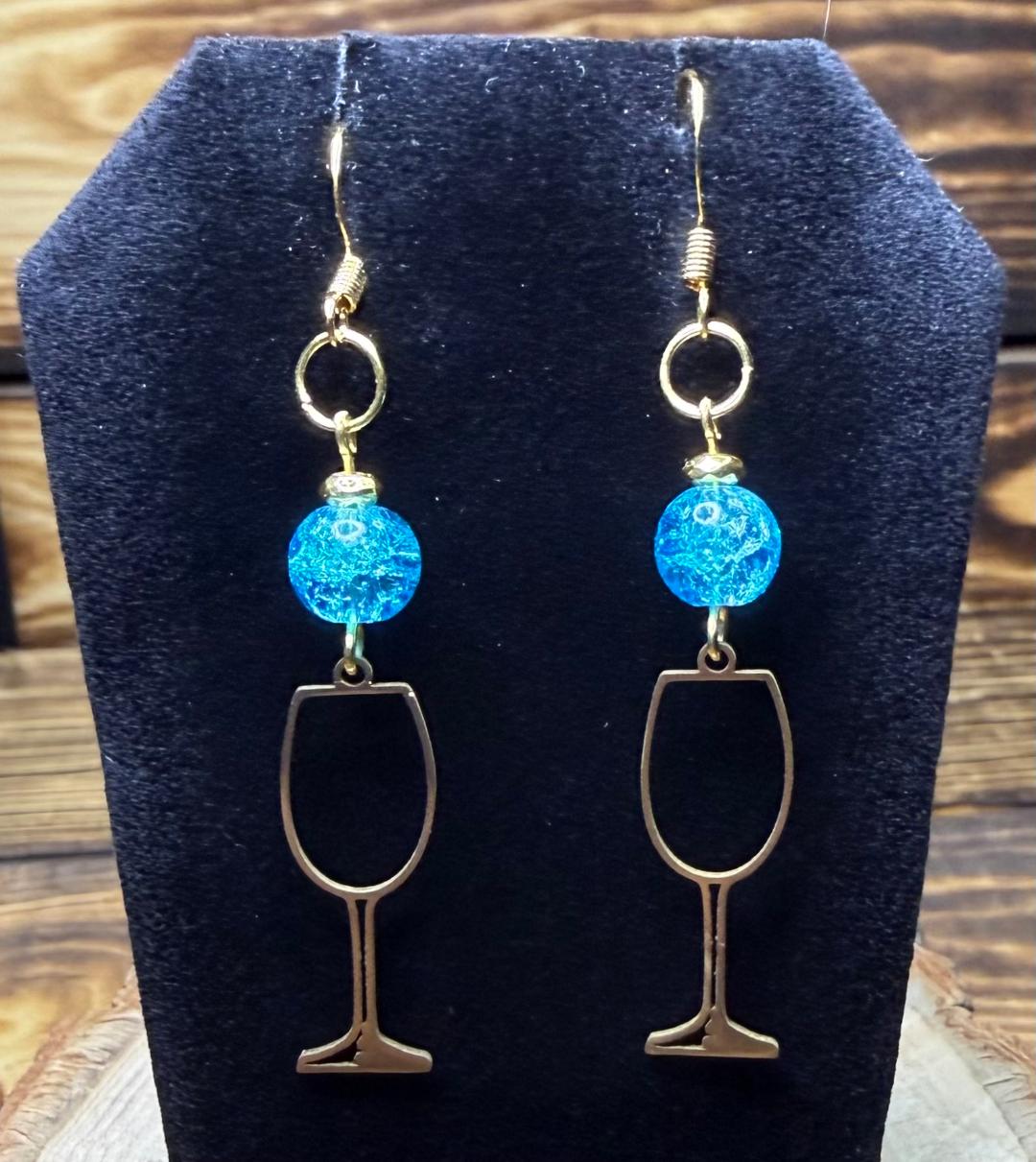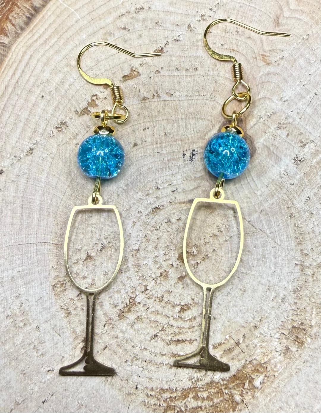 NEW GOLD STAINLESS STEEL WINE GLASS & BLUE BEAD EARRINGS