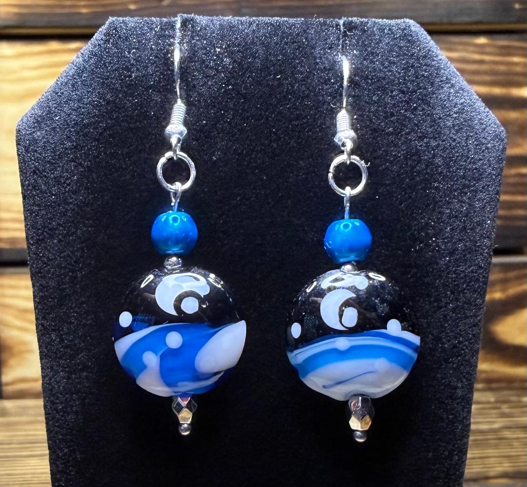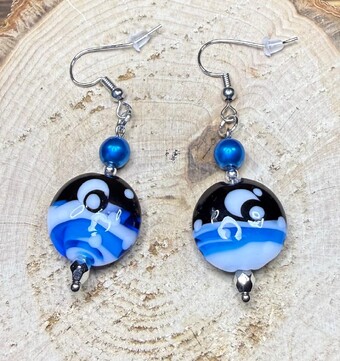 ![]() | Item #: 1006375 Click on image to see more pictures! A vibrant pair of glass charm earrings with a celestial moon scene. They are topped with pretty blue dyed glass beads and accented with silver seed beads and faceted silver beads as well. Made with nickel free earring hooks. Measurement Questions? Price: 20.00 |