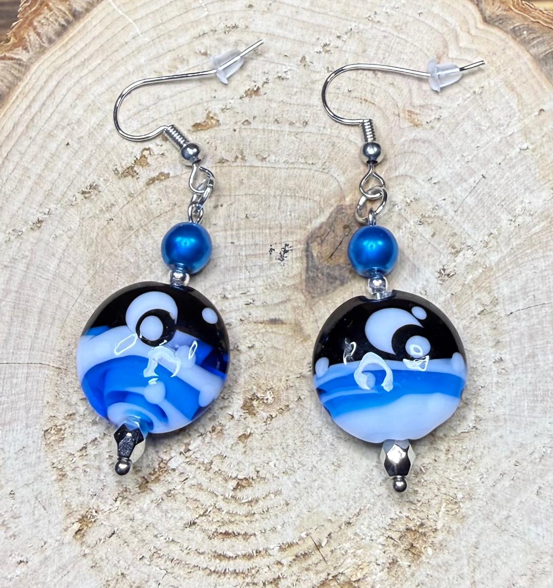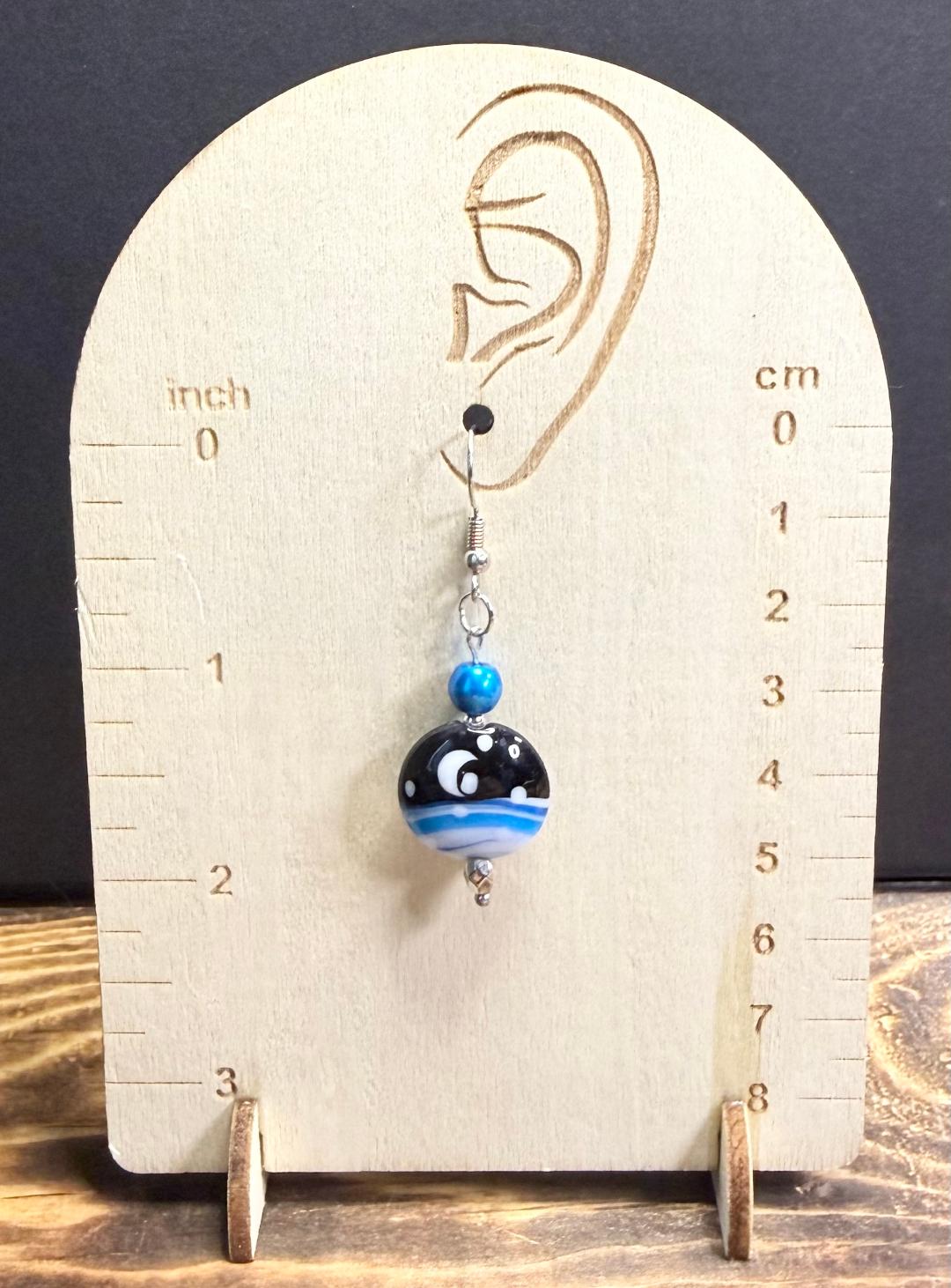 NEW AMAZING ROUND GLASS CELESTIAL MOON SCENE EARRINGS W/ BLUE GLASS BEADS