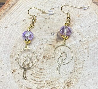![]() | Item #: 1006376 Click on image to see more pictures! A cute little cat with a hanging tail made in gold stainless steel. Topped with large glass faceted lavender beads and gold faceted hematite seed beads. Made with 18K gold plated, nickel free earring hooks. Measurement Questions? Price: 16.00 |