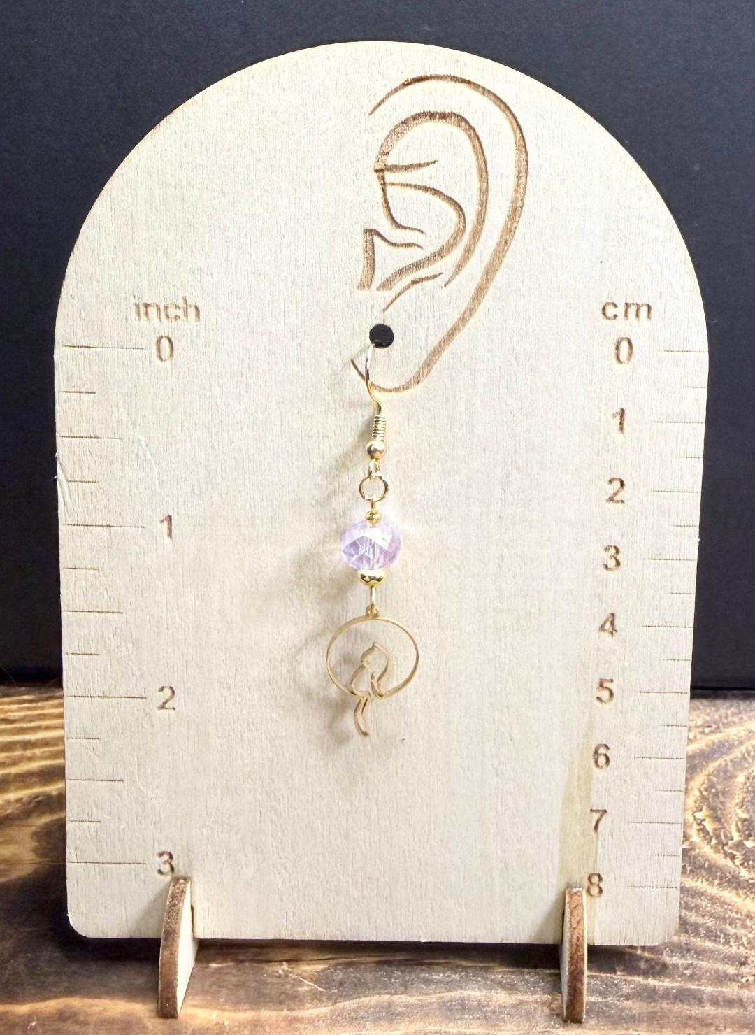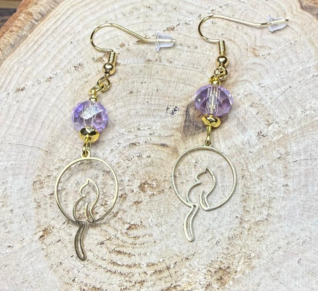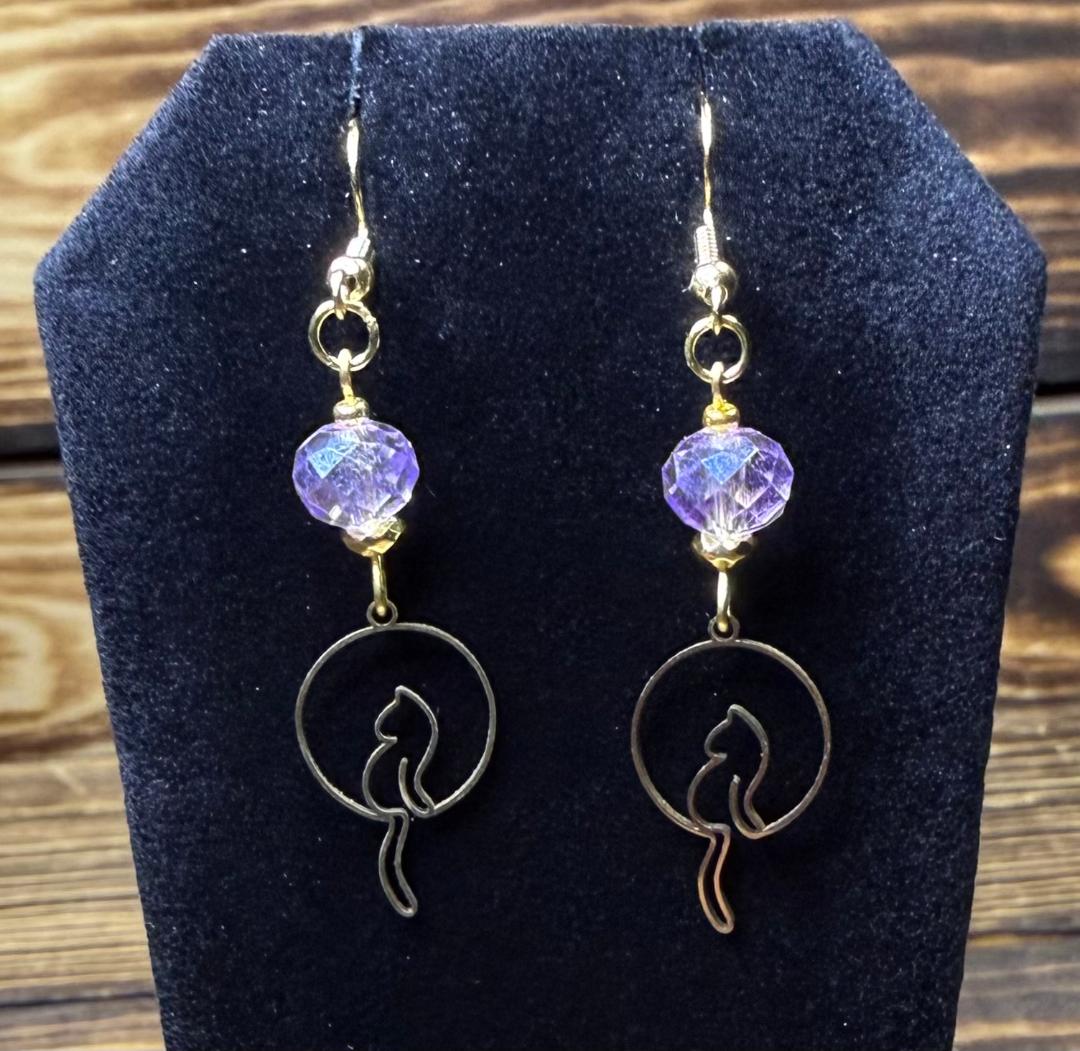 NEW GOLD DANGLING TAIL CAT EARRINGS W/ LAVENDER BEADS