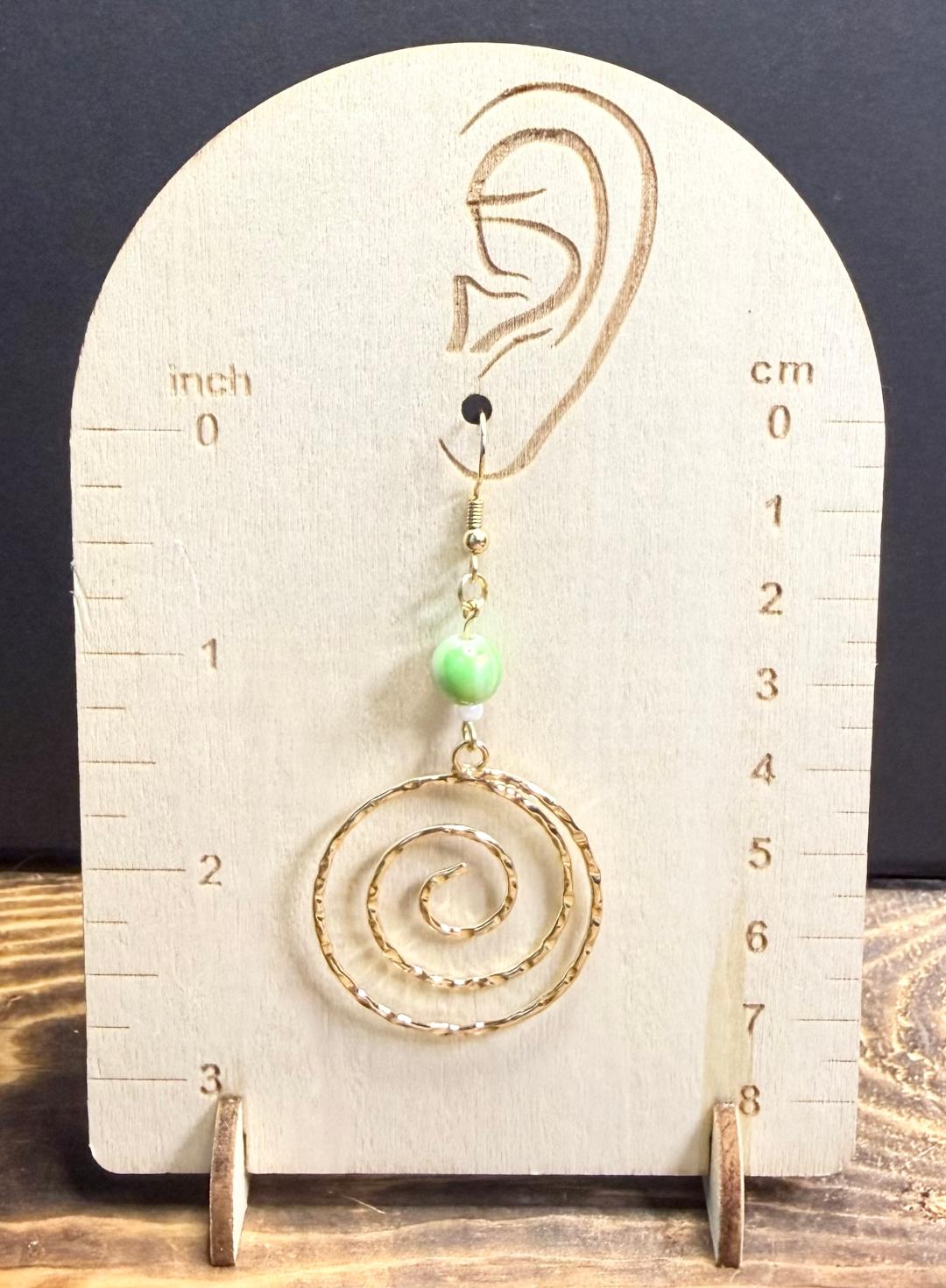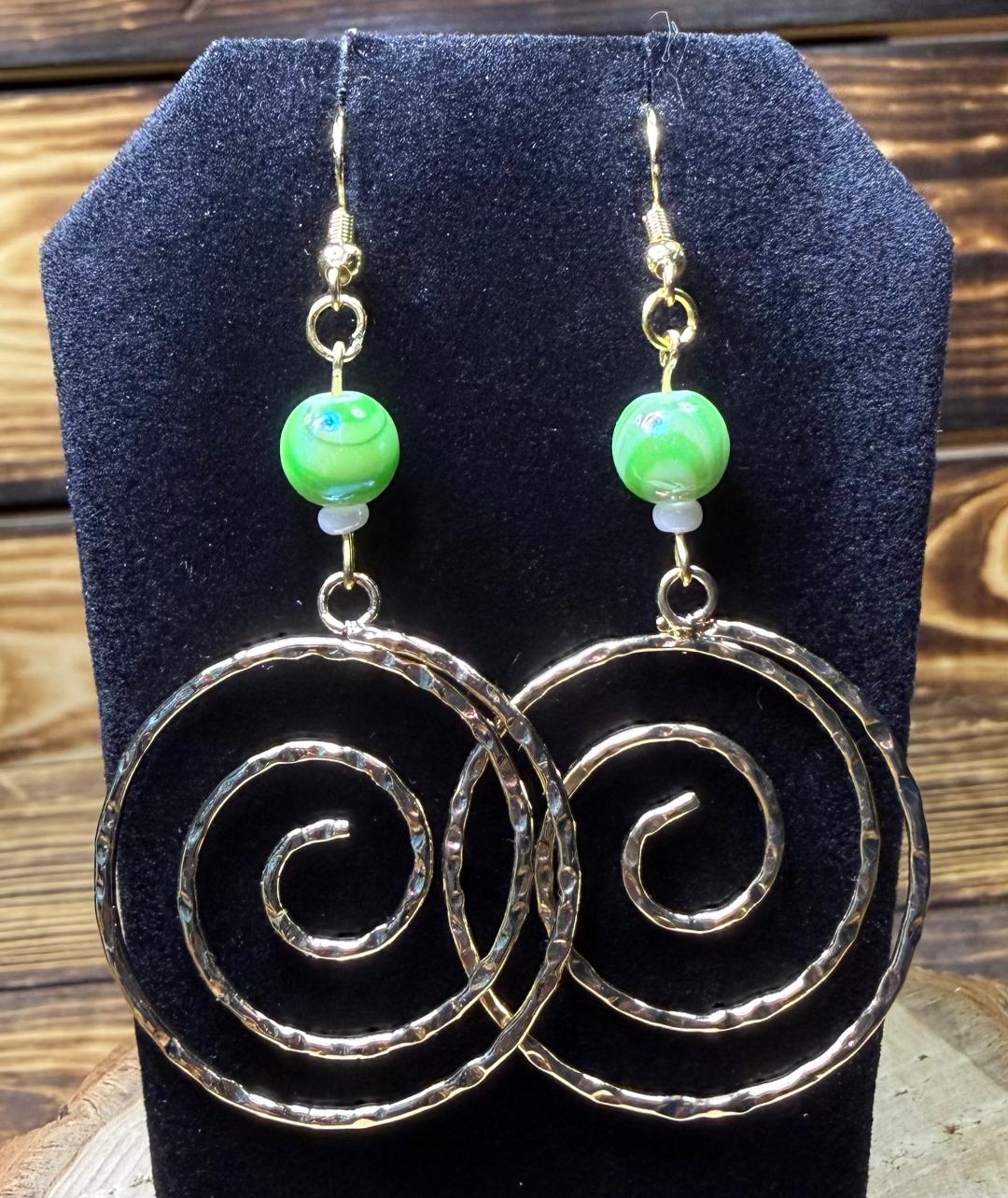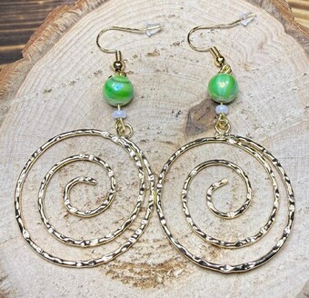 NEW HAMMERED GOLD SWIRL HOOP EARRINGS W/ GREEN BEADS