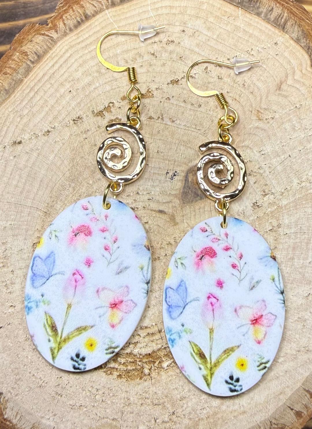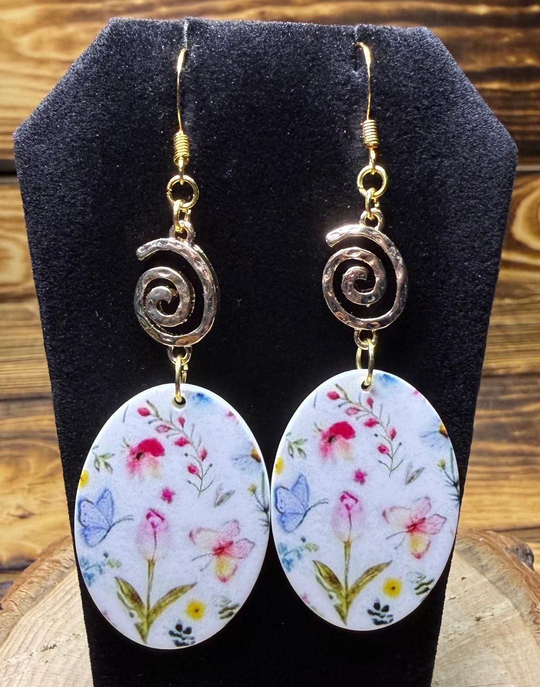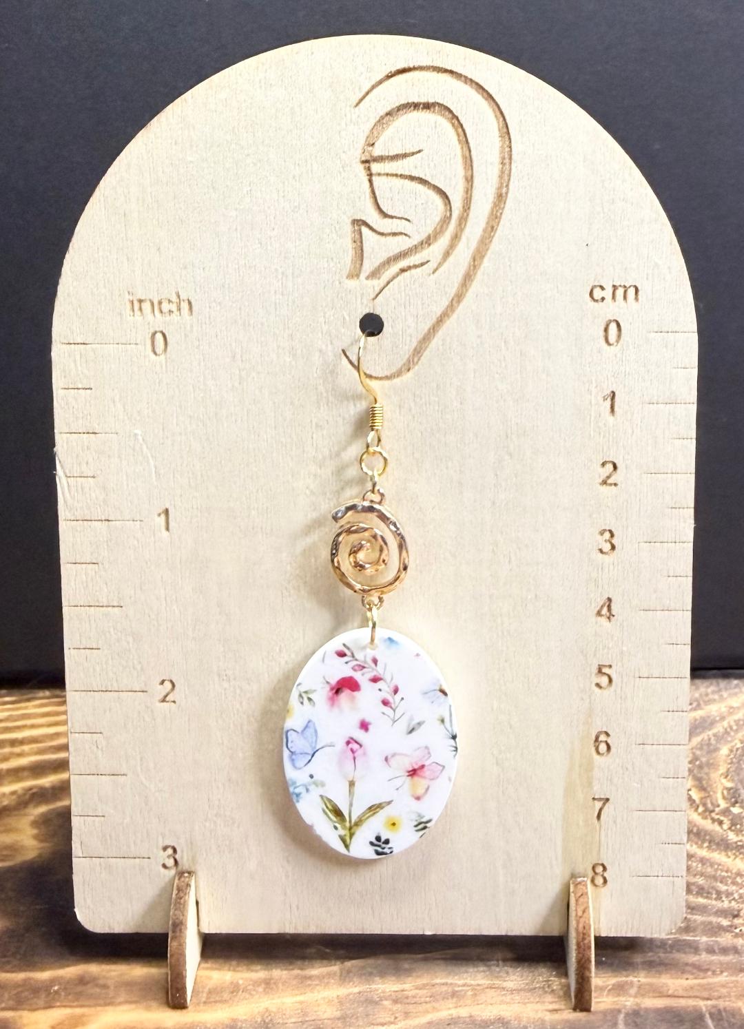 NEW OVAL ACRYLIC FLORAL BUTTERFLY CHARM EARRINGS W/ GOLD SWIRLS