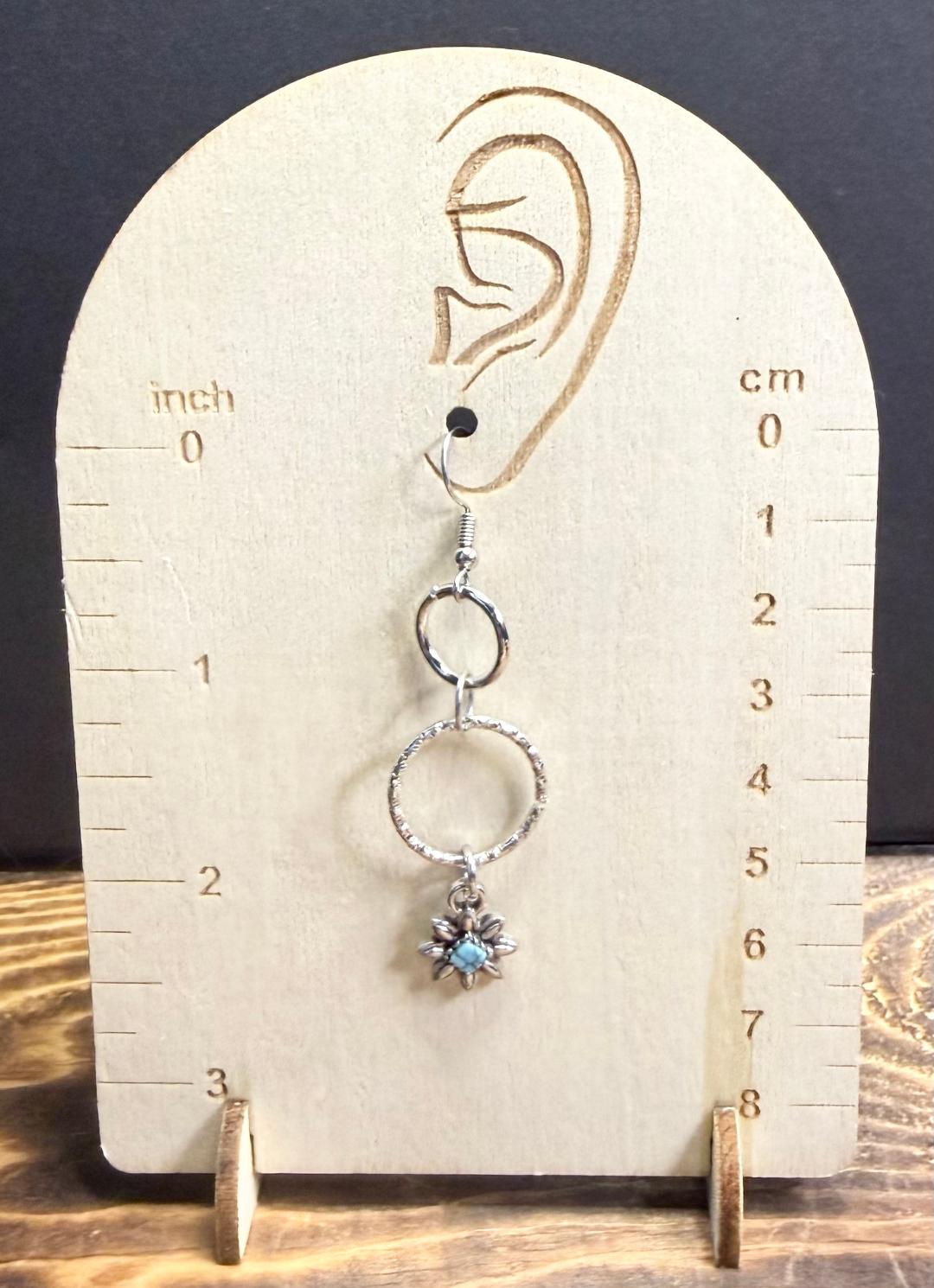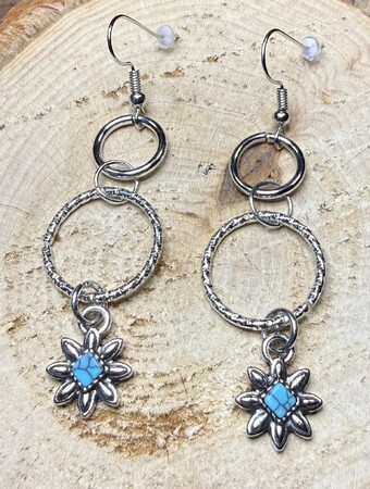 ![]() | Item #: 1006380 Click on image to see more pictures! A simple, yet pretty pair of silver earrings witha double hoop/ring and a tiny alloy flower with a faux turquoise center. Made with nickel free earring hooks. Measurement Questions? Price: 12.00 |