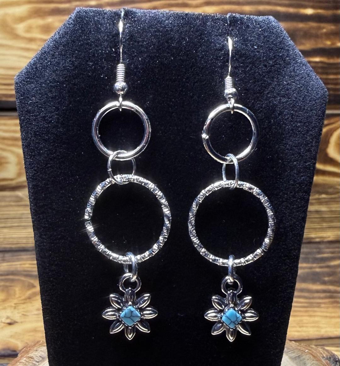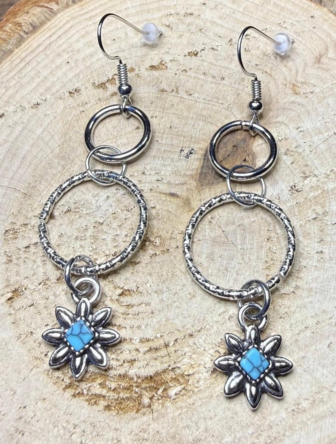 NEW DOUBLE HOOP EARRINGS W/ FAUX TURQUOISE CENTER FLOWER CHARMS