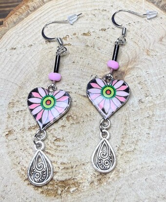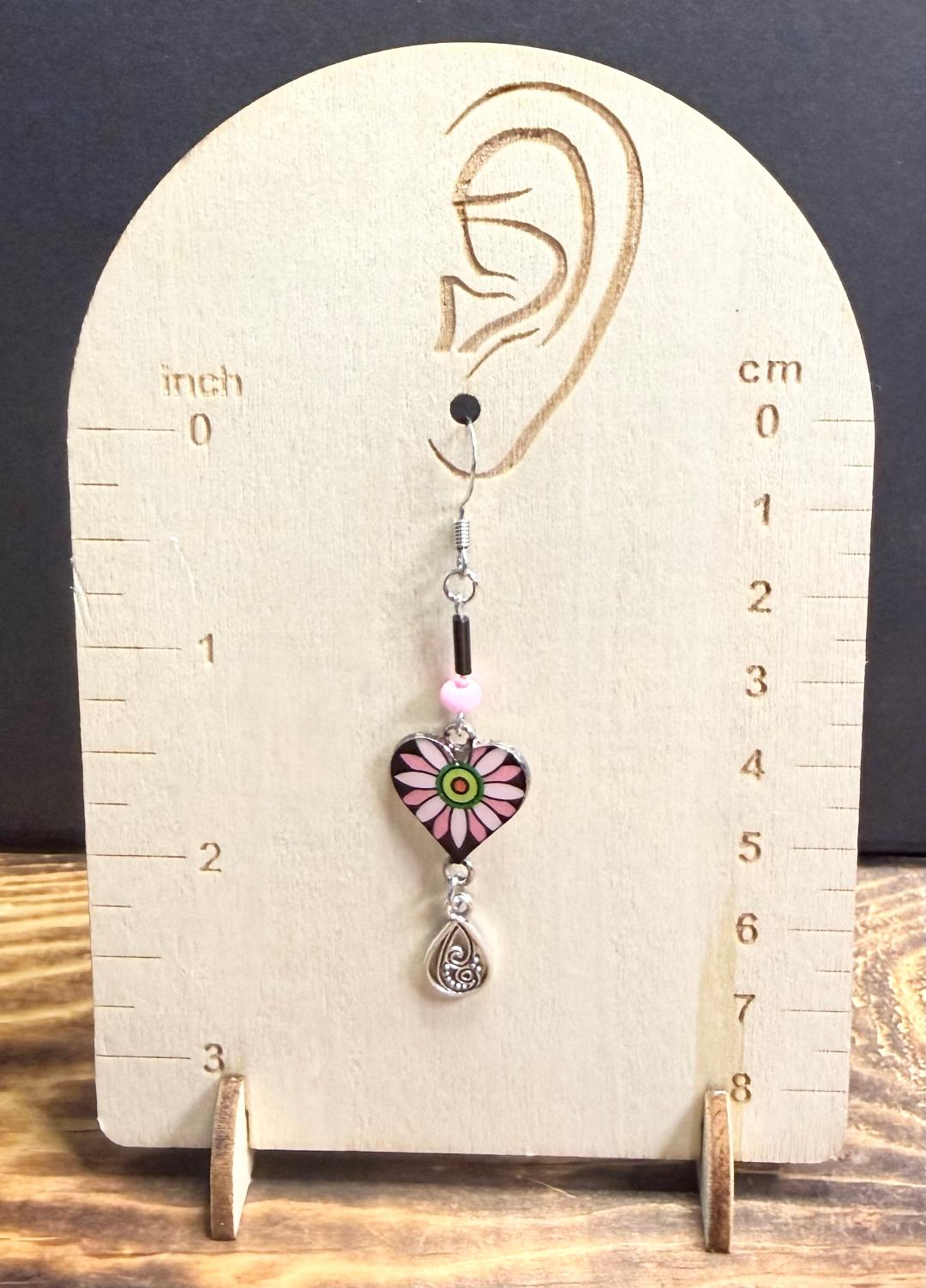 ![]() | Item #: 1006381 Click on image to see more pictures! A shiny front heart charm with pink accents and a green center. Topped with pink seed beads and black glass tube beads. There is a teardrop shaped filigreen charm on the bottom. Made with nickel free earring hooks. Measurement Questions? Price: 14.00 |