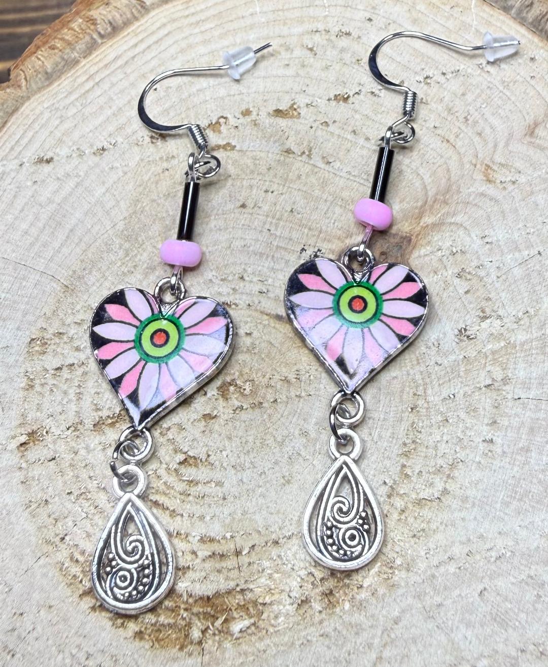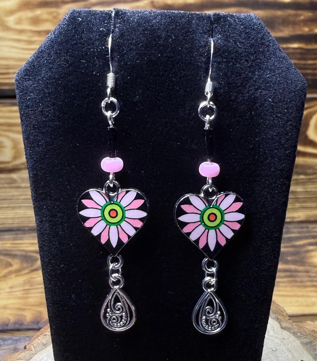 NEW BLACK & PINK HEART CHARM EARRINGS W/ FILIGREEN TEARDROP CHARM